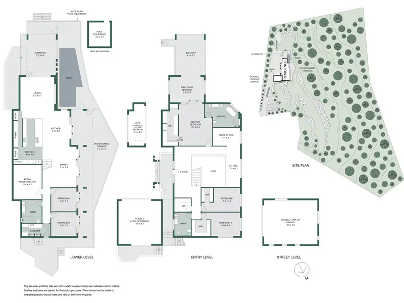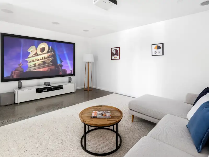 The lower level is dominated by expansive open-plan living spaces where the current owners have held large social events and functions of 100 plus guests, including a family room that opens onto a covered terrace, a home theatre with a projector, surround sound and full-size screen, several casual living spaces, and a dining room under a soaring double-height ceiling that opens onto a large sunlit poolside terrace with panoramic views of the bushland.