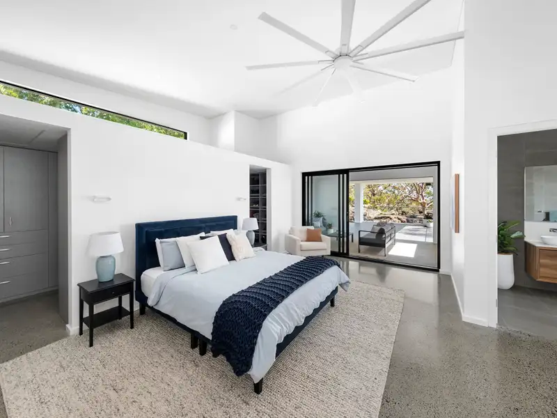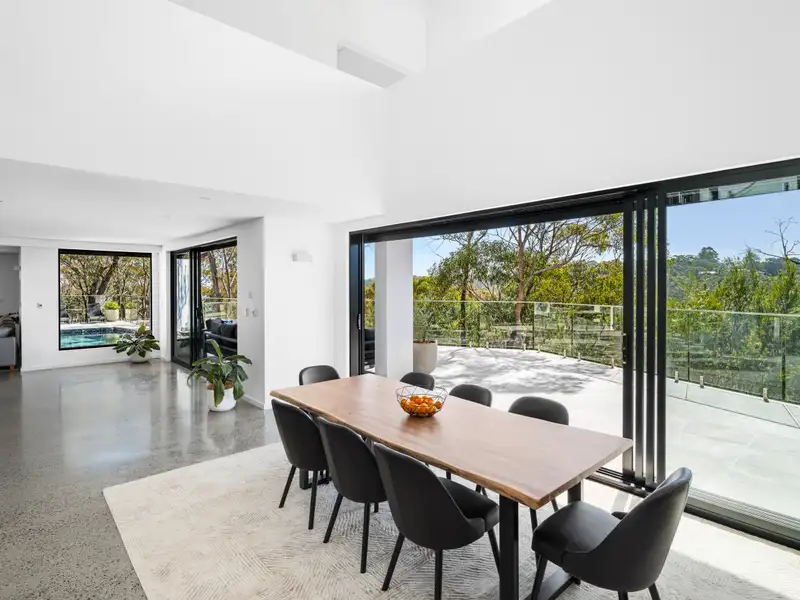 Blending seamlessly with its natural bushland surroundings and substantial landscaped areas, featuring earthy stone finishes and expansive retractable glass walls that blur the boundaries between indoor and outdoor living whilst boasting spacious open-plan interiors, expansive sun-drenched terraces-both covered and open-and a sparkling pool.