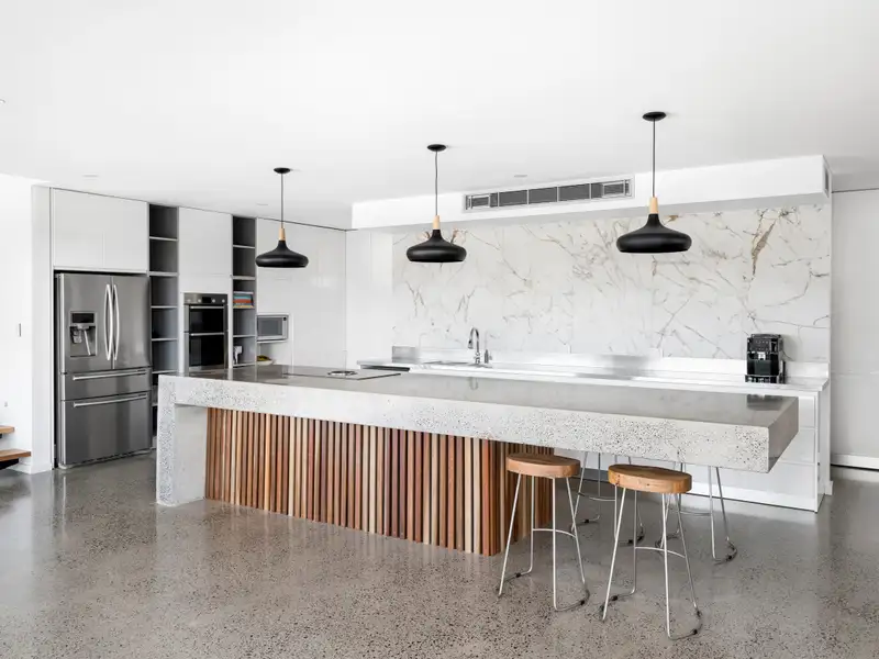 At the heart of the home, the kitchen is both sophisticated and earthy, centered around a large polished concrete island. It features stainless steel countertops, premium European appliances, and a walk-in pantry.