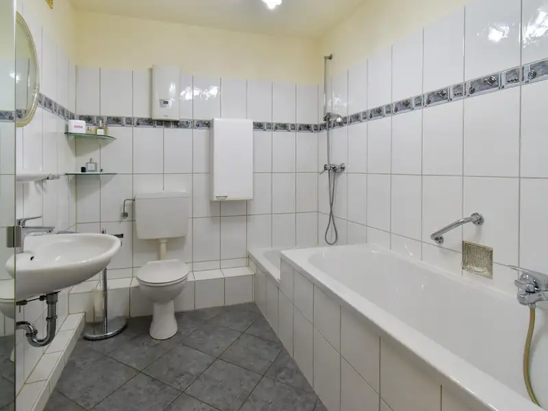 The apartment is heated by electric underfloor heating, which provides even, pleasant warmth in all living areas and the bathrooms. The hot water is supplied by instantaneous water heaters. The monthly rent is € 330, heating costs are not included.