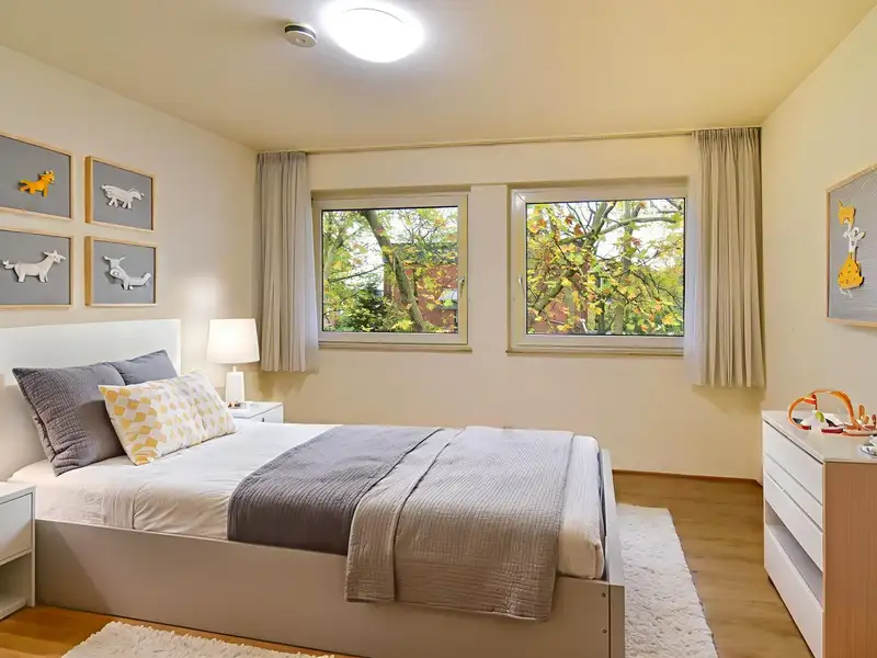 Four rooms offer a variety of uses - as a bedroom, study or guest room. The living room opens onto the balcony, which offers a peaceful outdoor space - perfect for relaxing in the fresh air. Large windows allow plenty of light into the rooms throughout the day and create an open, friendly living atmosphere.
