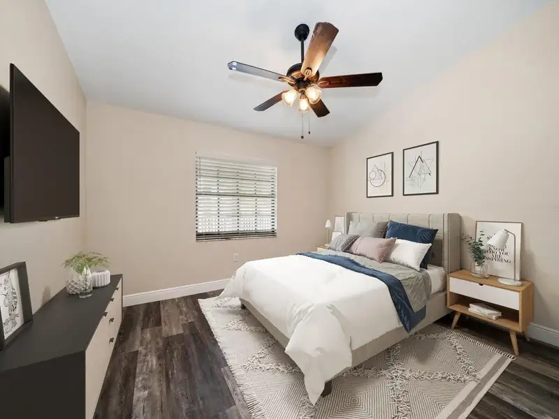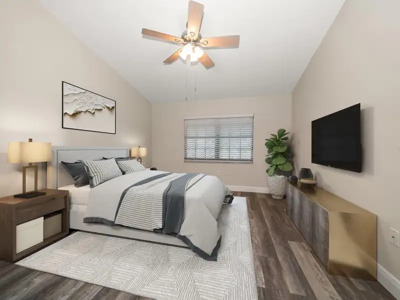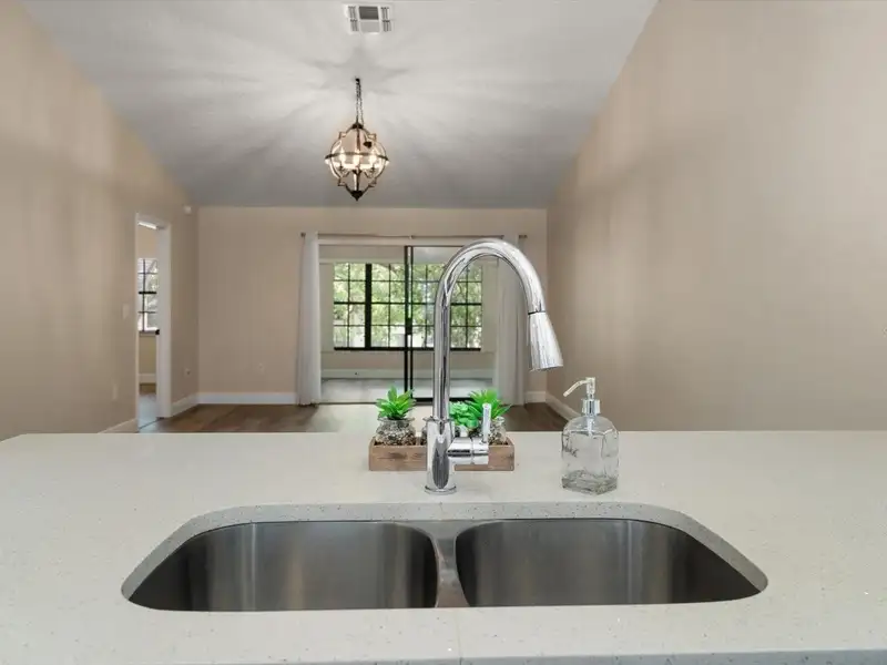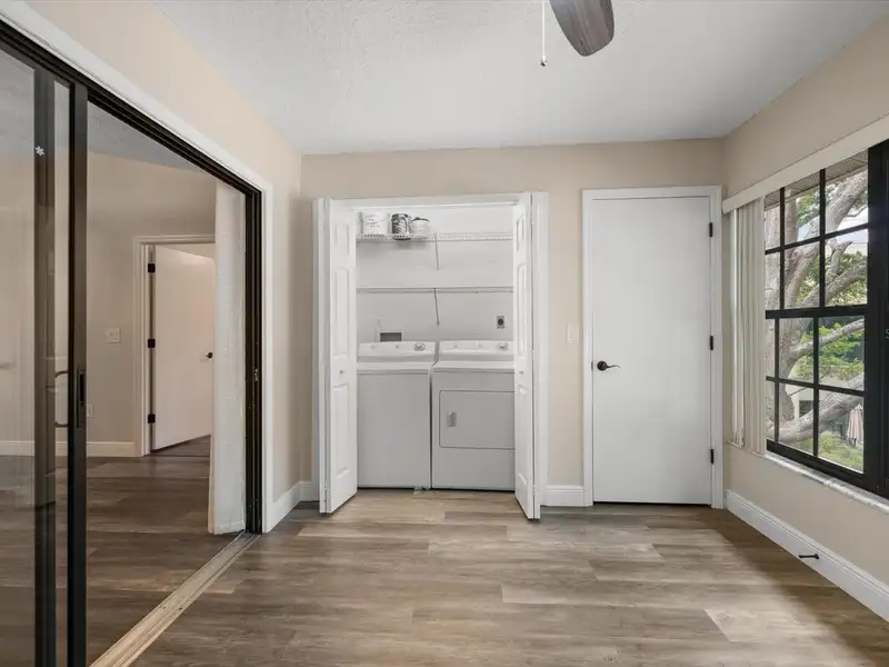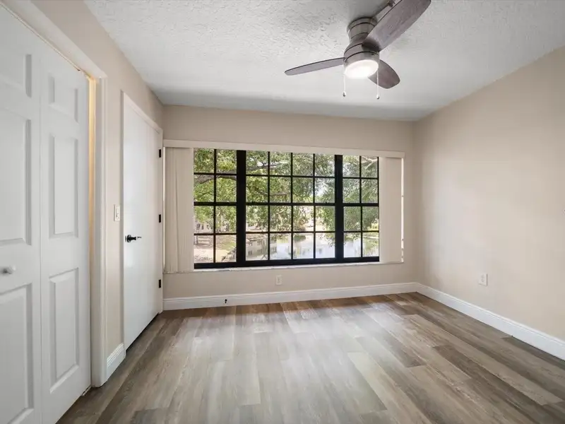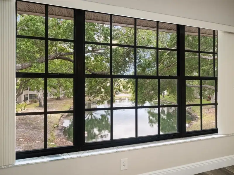 An open concept the kitchen and dining space seamlessly connect to the living room, with sliding glass doors that open to the enclosed sunroom, and you’re greeted by a peaceful lake view and lush greenery—your private escape for morning coffee or evening relaxation. The sunroom includes a spacious and convenient laundry closet, and a big storage closet.