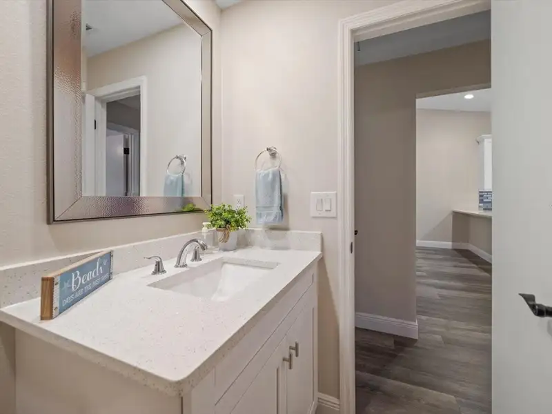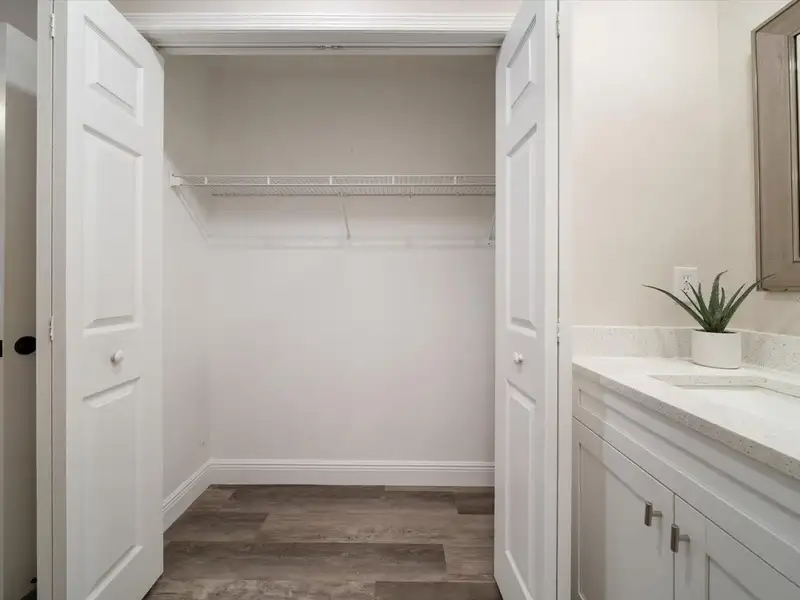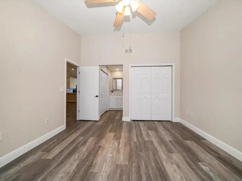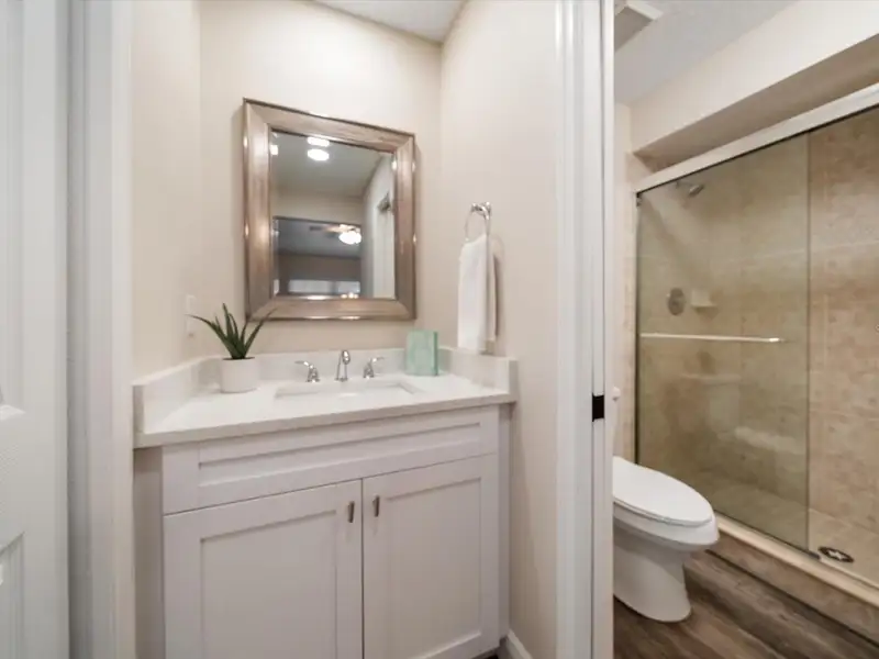 Back inside, the primary suite is a sanctuary of its own. Positioned away from the main living areas for maximum privacy, it features vaulted ceilings and a window facing the lake, and 2 closets. The en suite bath is a dream, boasting a walk-in shower with glass doors, quartz countertops, soft close cabinetry, and a pocket door for privacy.