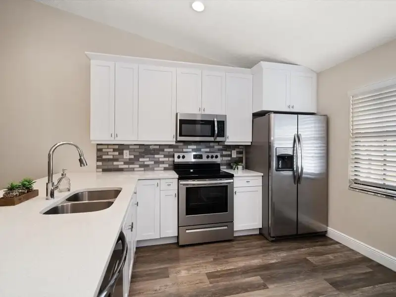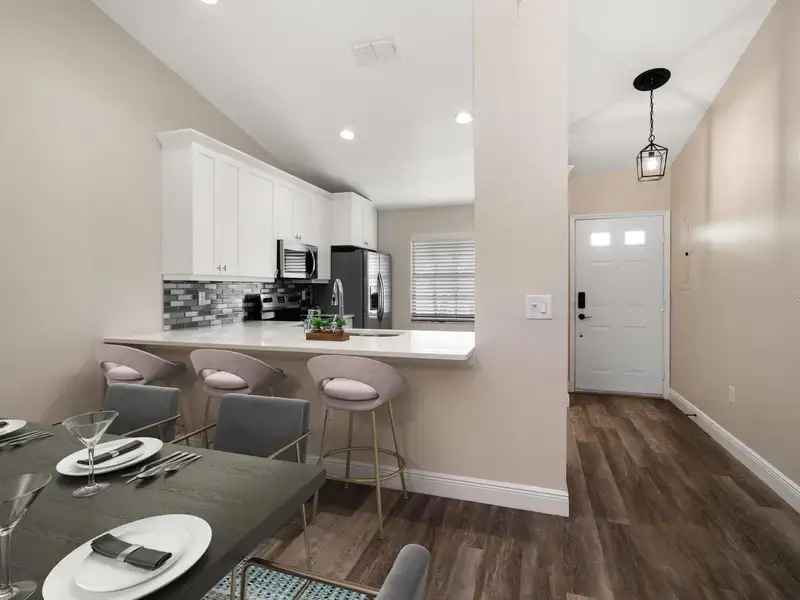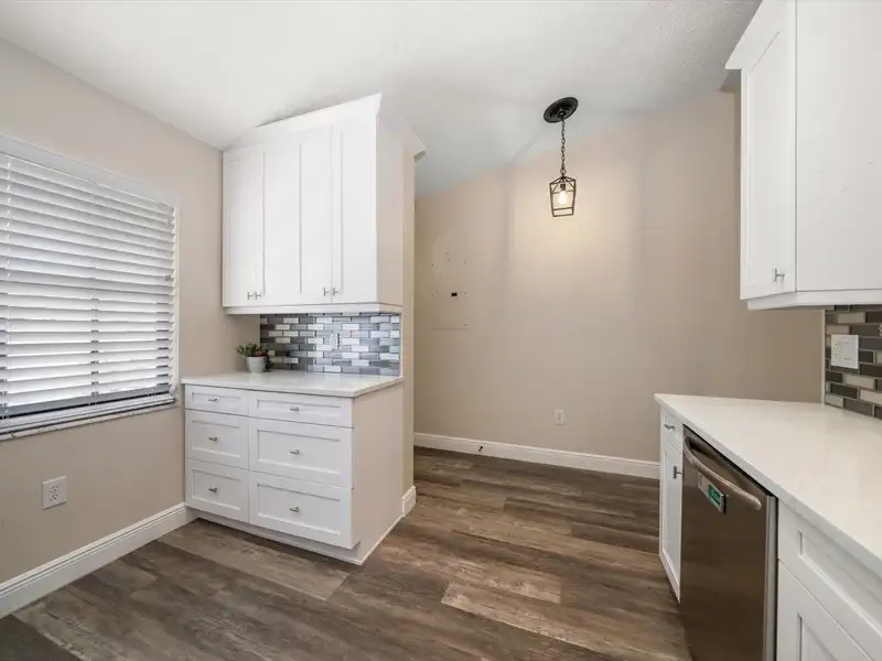 The sparkling clean, fully updated and open gourmet kitchen is both stylish and functional. Soft-close 42” cabinetry provides ample storage, while gleaming quartz countertops, glass tile backsplash, a coffee bar with large storage drawers, and a single-level breakfast bar invite casual conversations over morning coffee. All Frigidaire stainless-steel appliances 2021.