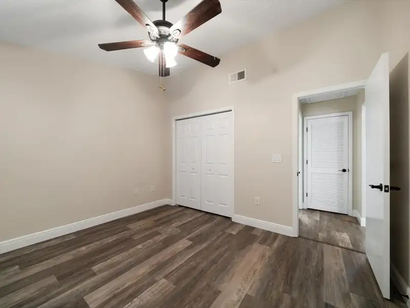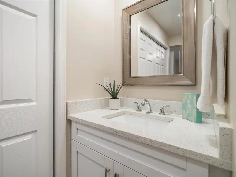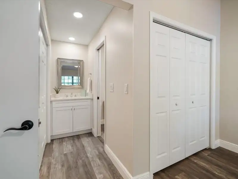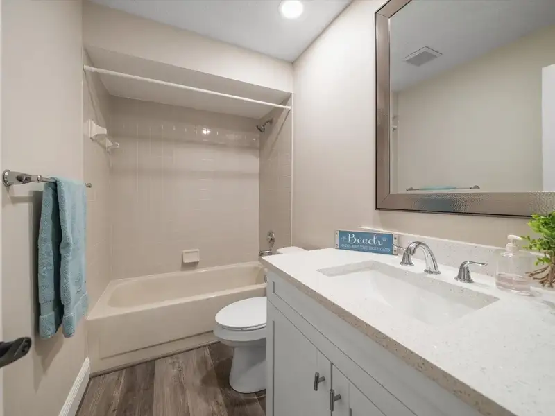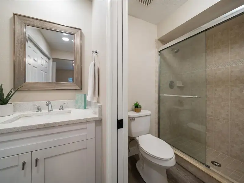 A split plan, the second bedroom is at the front of the unit next to an updated hall bath with quartz counters, soft close cabinets and a tub/shower conveniently located for guests, a hall linen closet and pull down steps to access plentiful attic storage space.