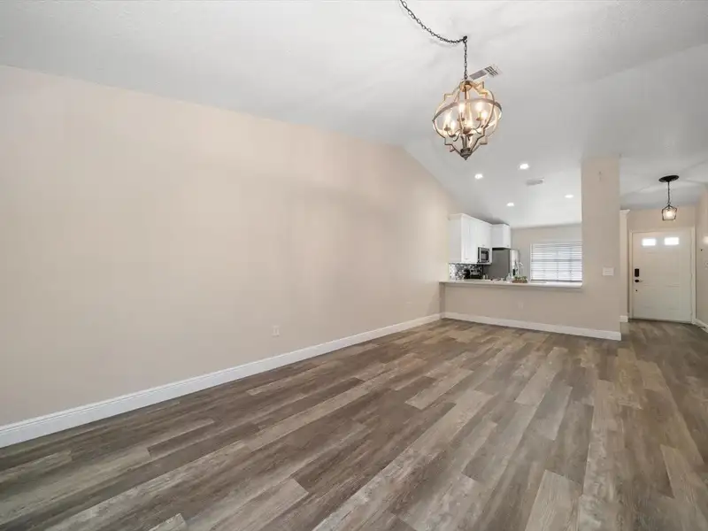 Up the stairs to this 2nd floor unit you are met with a cozy space for outdoor seating on the front of the unit. Step inside, and you'll instantly fall in love with the open-concept design and high-end finishes throughout, you will immediately be drawn into the light filled space, the 12’ vaulted ceilings create an airy openness throughout the main living areas. Luxury vinyl plank flooring in every room sets a warm yet sophisticated tone.