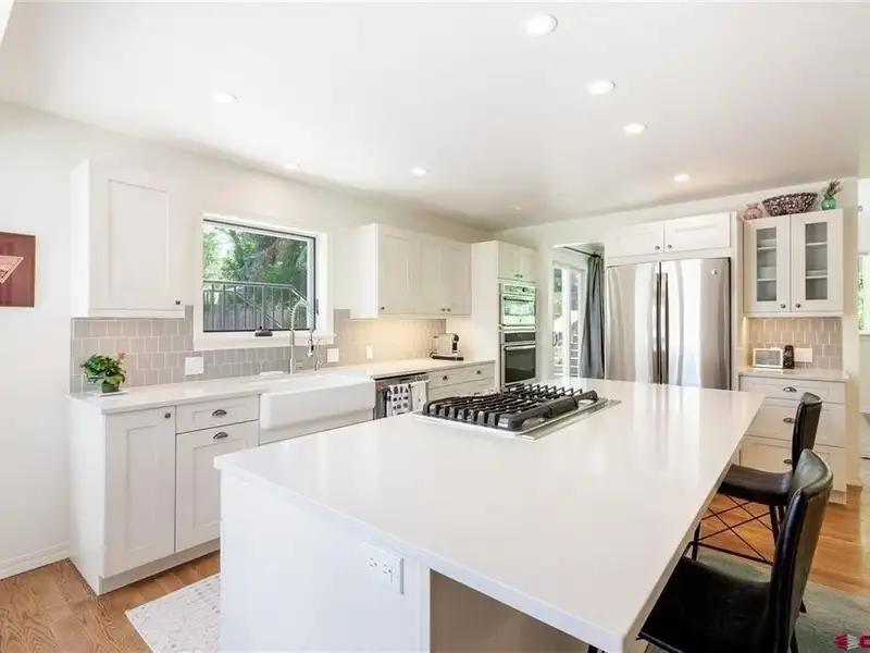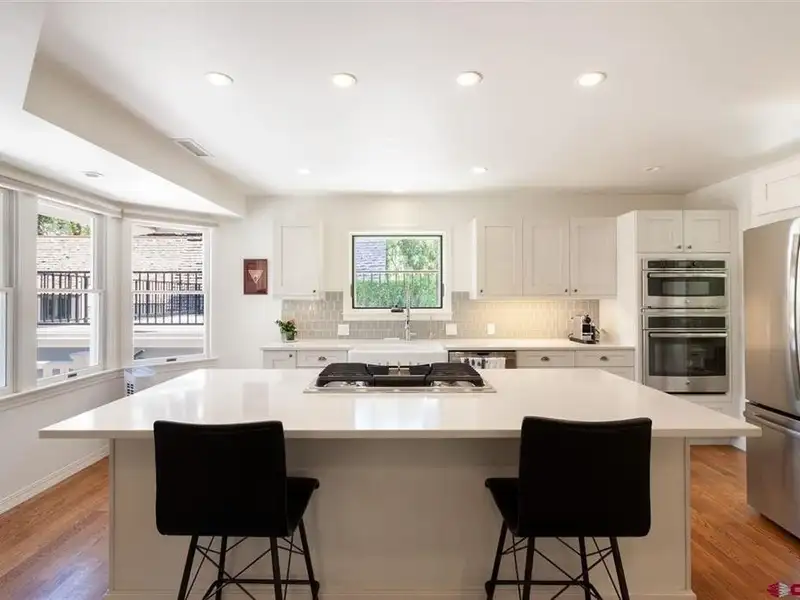 - Chef’s kitchen with quartz counters and wine fridge