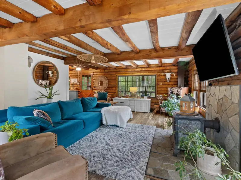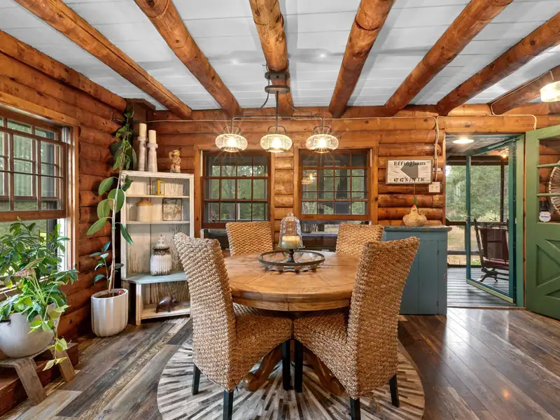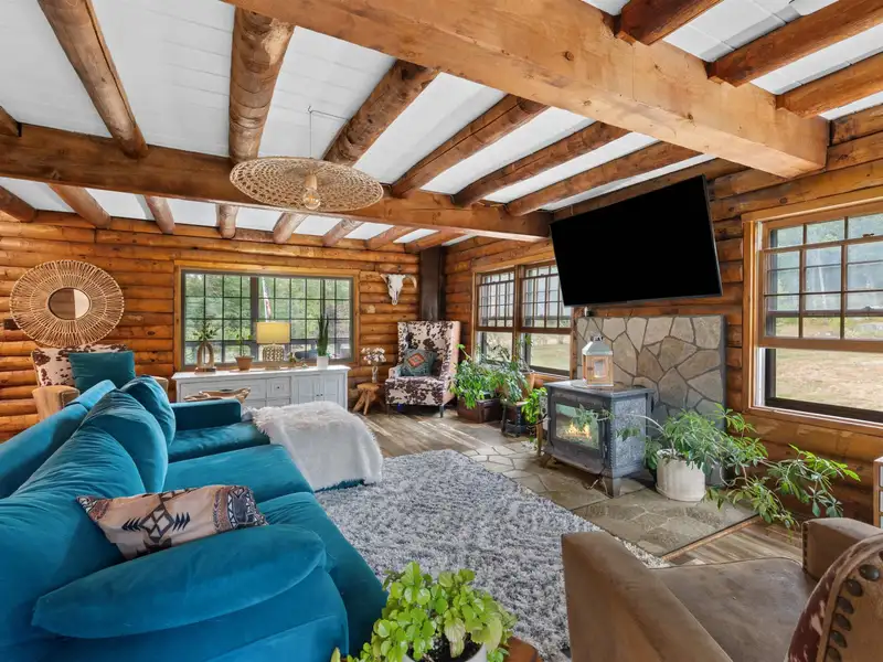 - Gambrel style log home with rustic charm