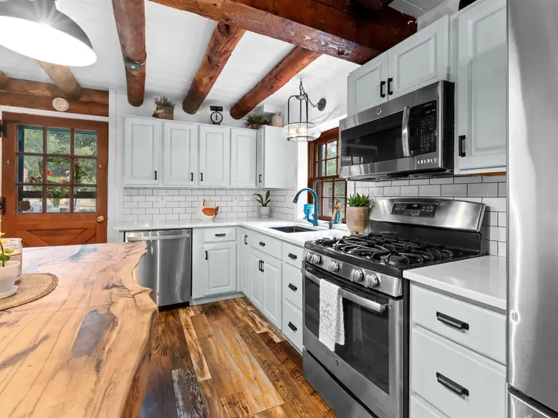 - Live edge island in stylish kitchen