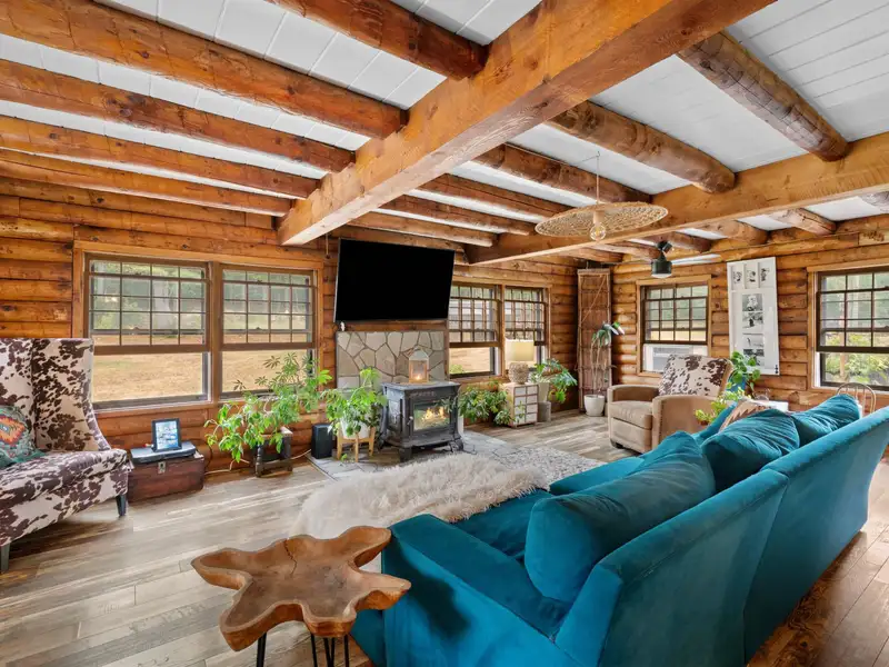 - Soapstone woodstove warms living room