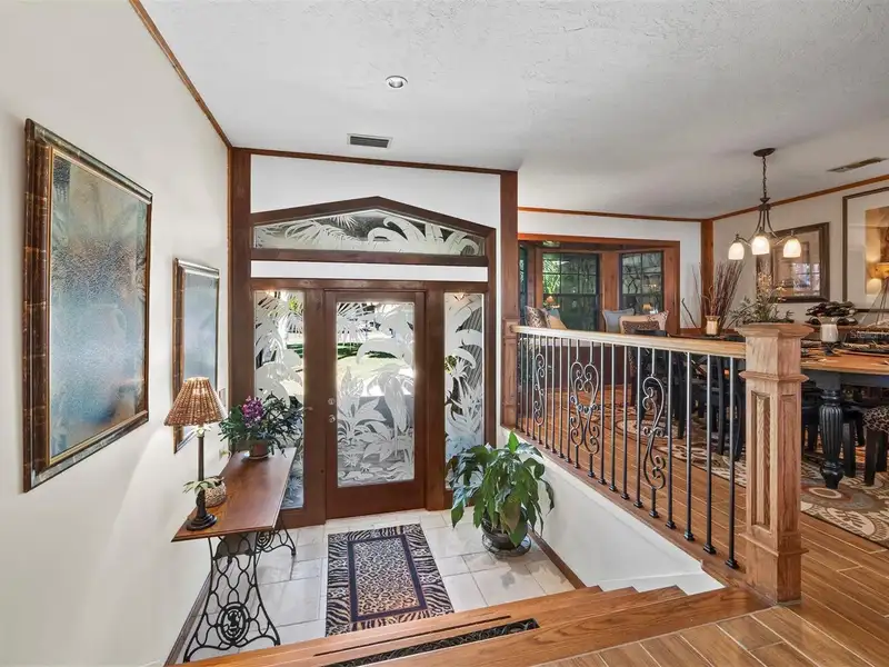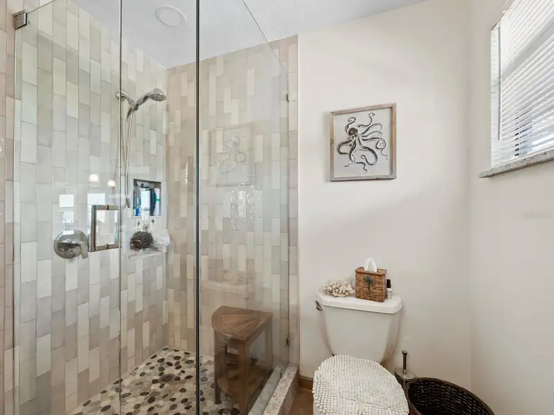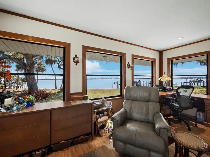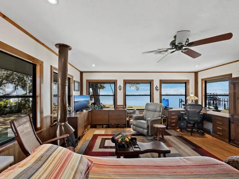 - Stone fireplace in cozy sitting area