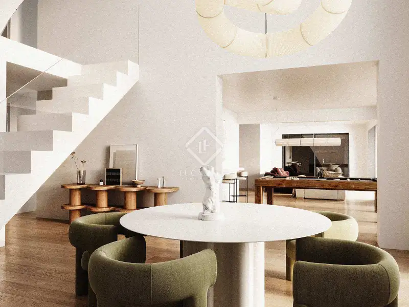 The ground floor (semi basement) complements the day area on the ground floor with additional spaces, both being joined by the fantastic double space above the large formal dining room and its spectacular cinema-style staircase. The dining room is open to the second living room of the house, designed in two areas, one for a billiards or piano area and the other area for sofas with south-facing balconies and access to the terrace and garden. Next to the dining room is a second closed kitchen with natural lighting through a patio, designed both to serve this floor and to prepare the menu for special family-friendly and social events.