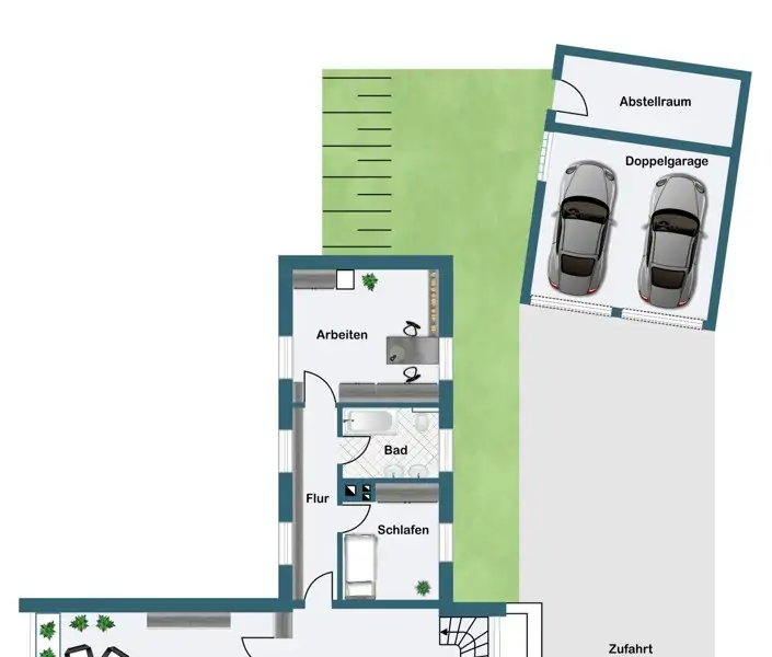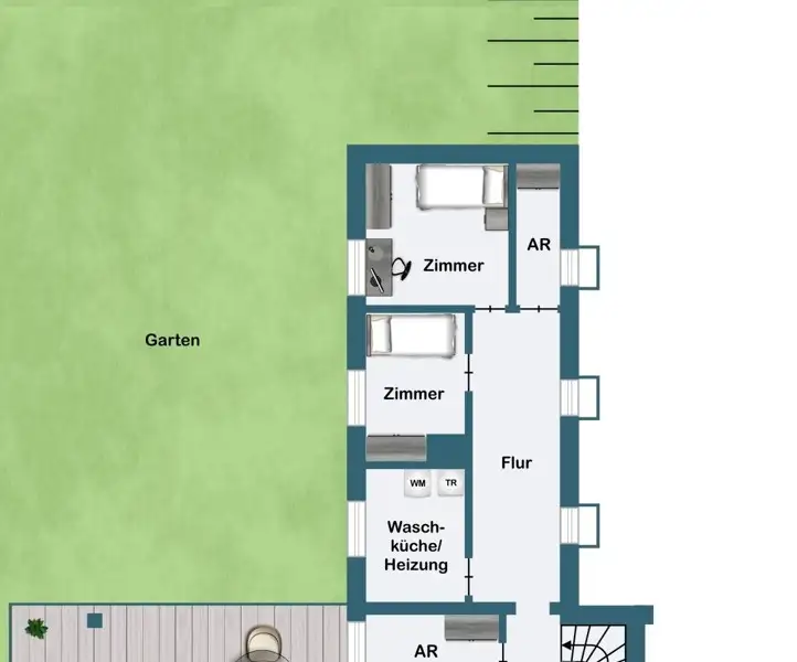 The basement has approx. 64 m² of living space and offers four rooms, including one room with access to the garden and patio, a shower room, two storage rooms and a boiler room with laundry room. The rooms can be used flexibly as a study or bedroom as well as a guest or hobby room.