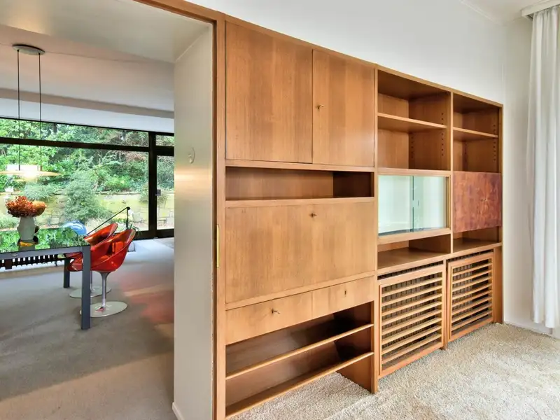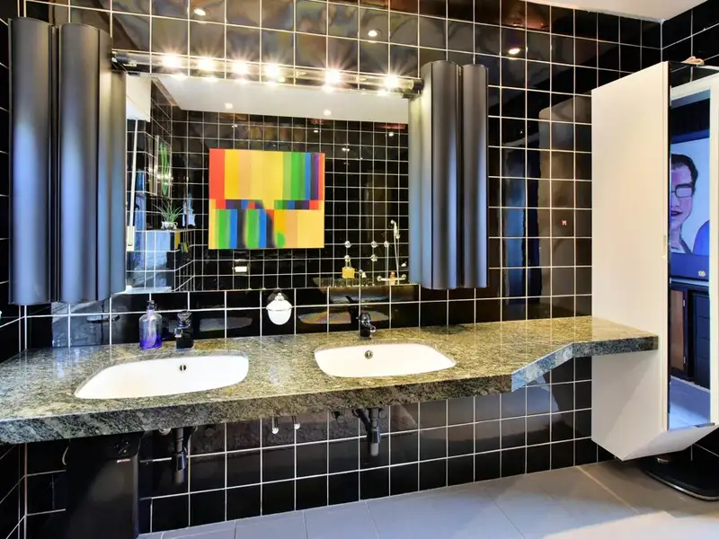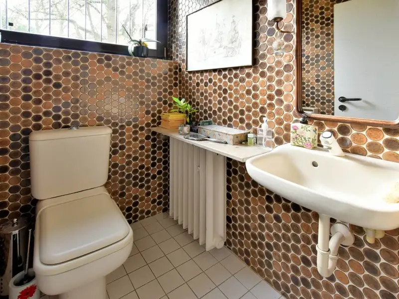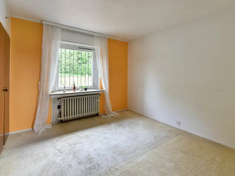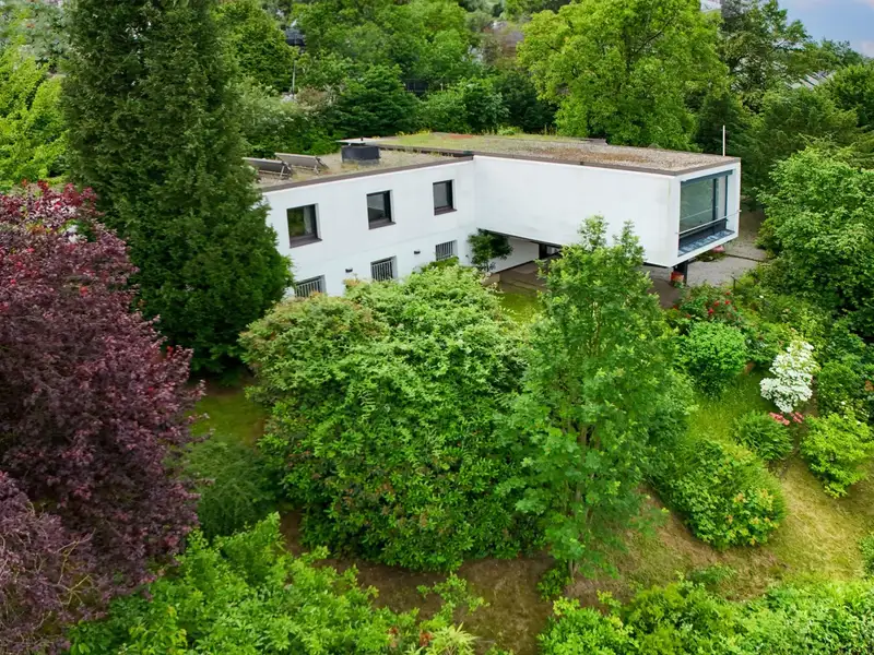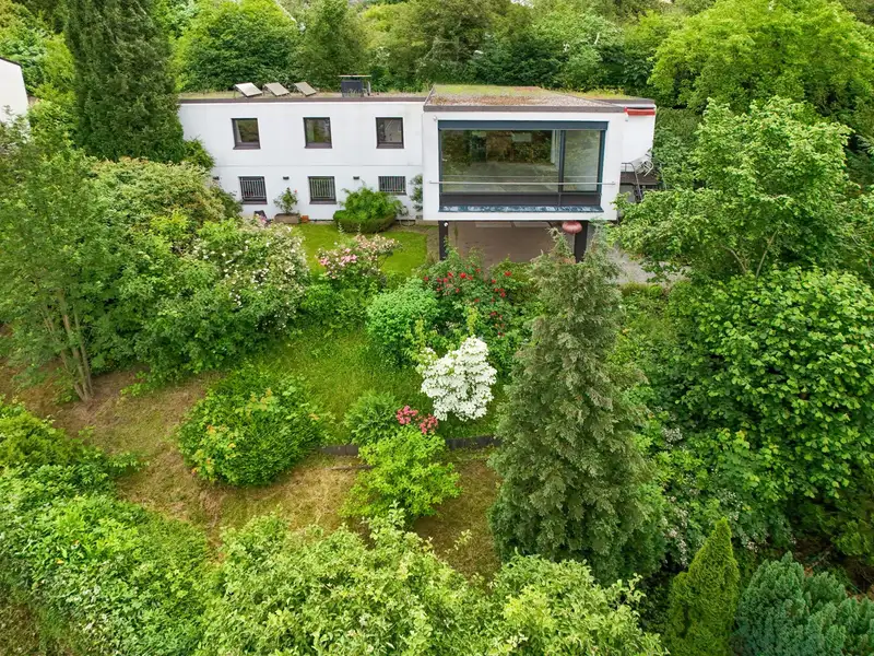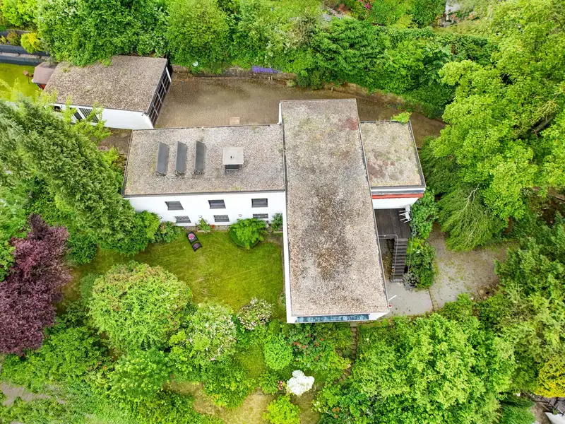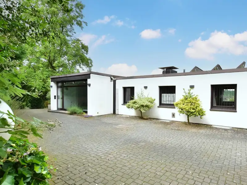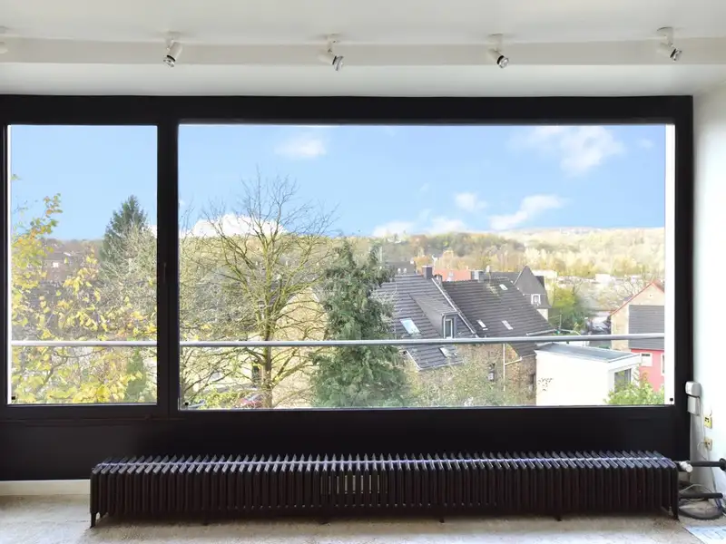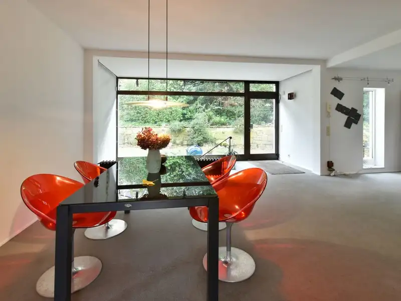 This impressive property in Essen Kupferdreh was built in 1956 in a cubic architectural style and will delight you with its individuality and phenomenal views over the Ruhr Valley. Known in Kupferdreh as the "TV house", the property is located in a quiet residential area on a slight slope, is surrounded by greenery and offers you plenty of privacy.