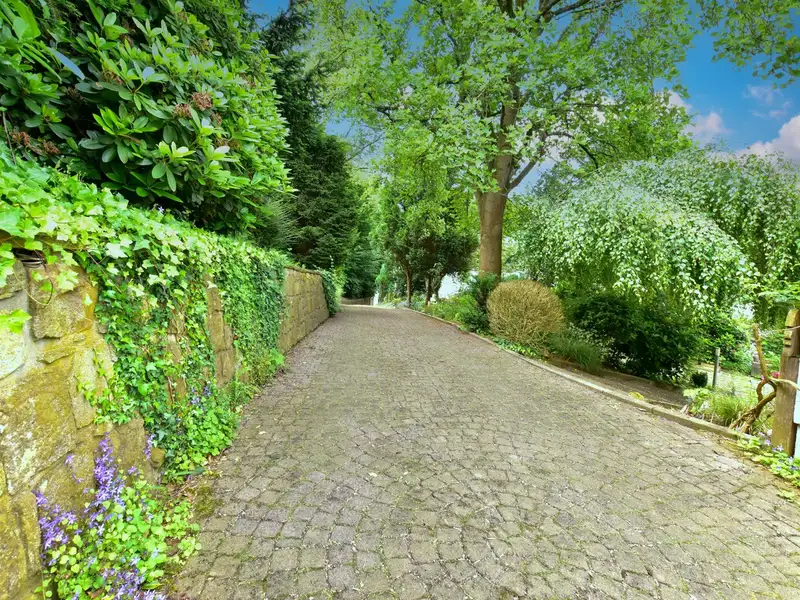 A beautifully overgrown driveway from the main road leads to the forecourt of the house, where there is a large double garage. The house entrance with its wide glass front is very inviting and allows plenty of light into the large hallway, which you can use as a central room in many different ways.