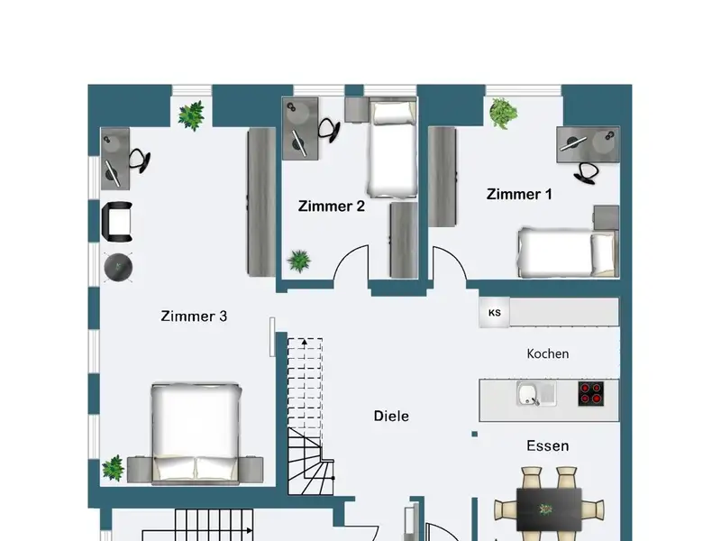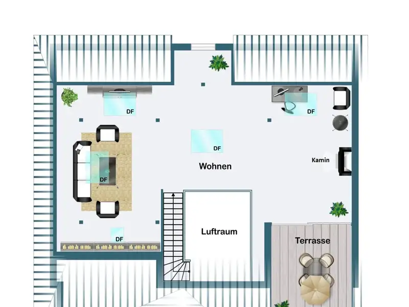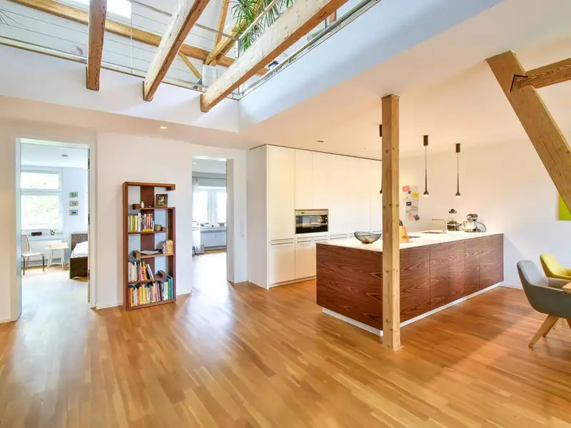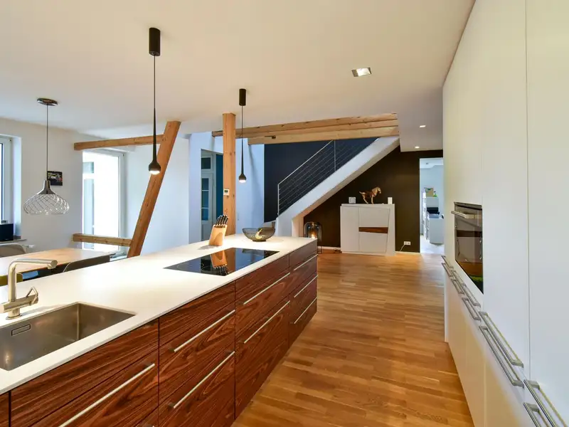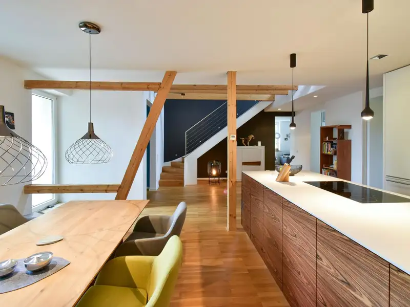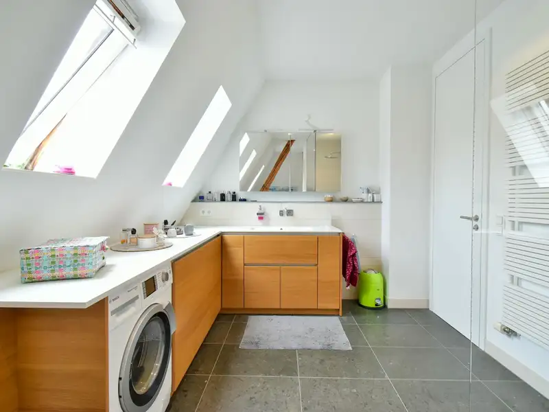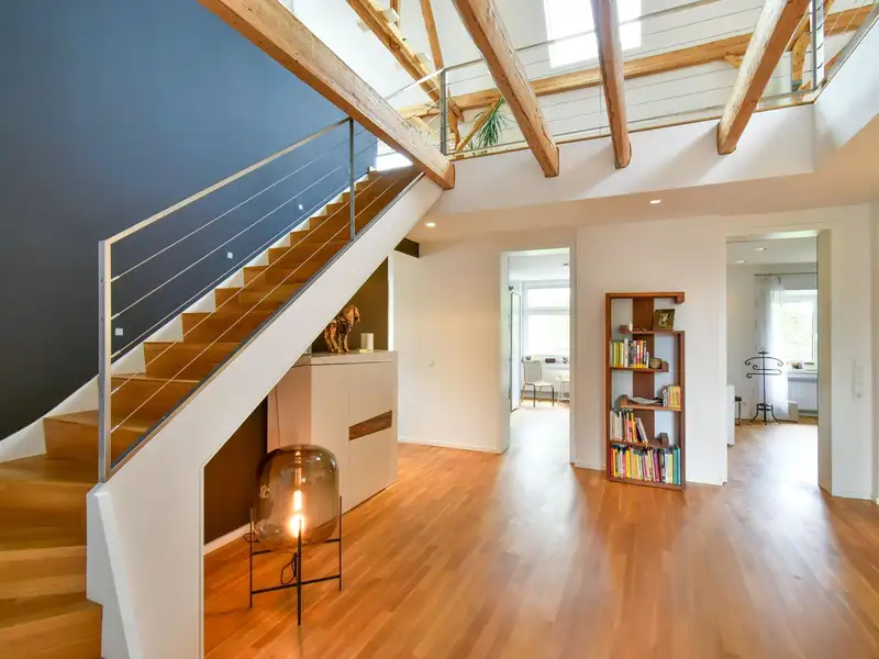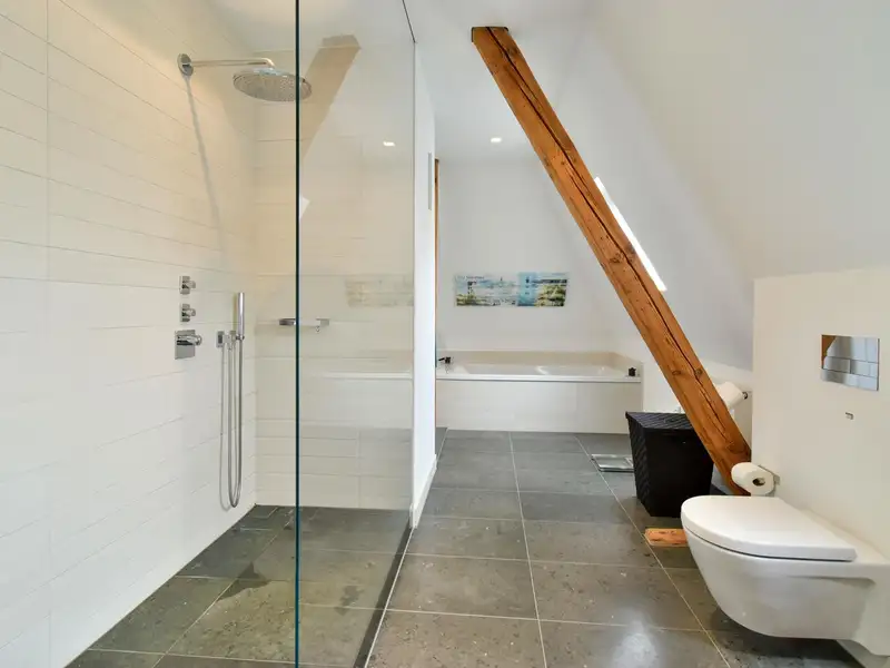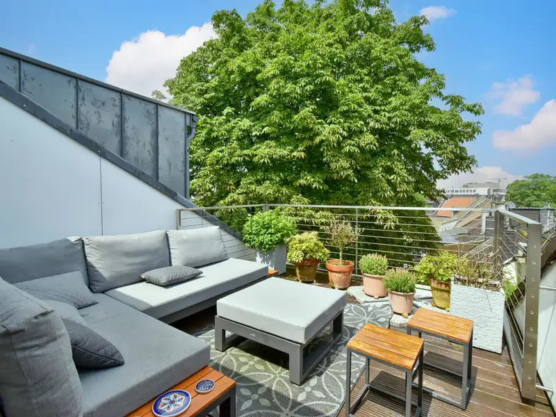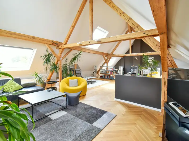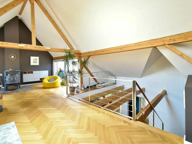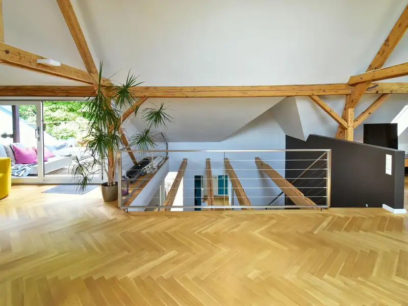 A staircase leads you to the highlight of the apartment: the open attic with exposed wooden beams and an inviting fireplace. This area lends the apartment a special charm and creates a unique living ambience. From here you have access to the spacious roof terrace, your private outdoor retreat.