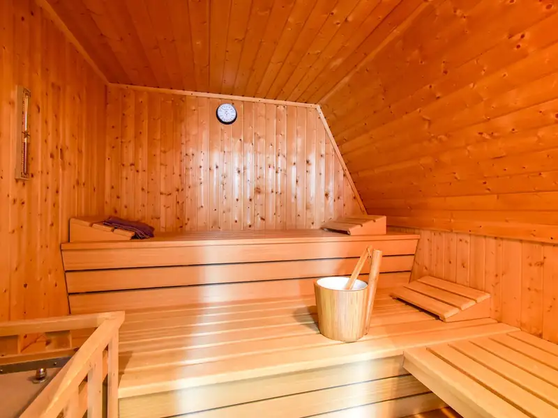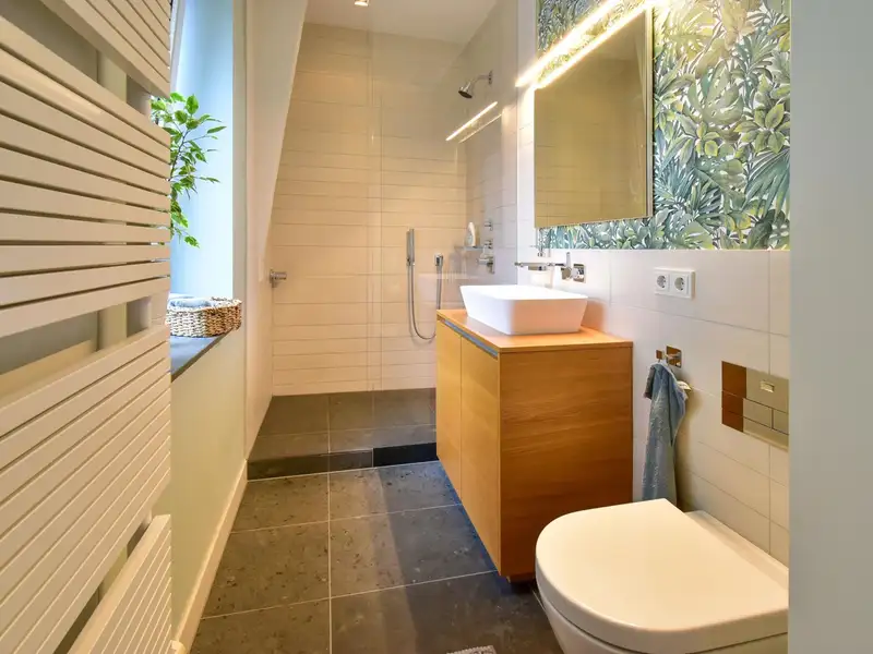 The modern bathroom impresses with its design and functionality. With a bathtub, a separate shower and an integrated sauna, your personal wellness experience is perfect. Here you can enjoy luxurious moments of relaxation within your own four walls.