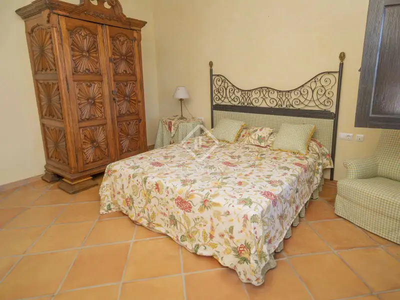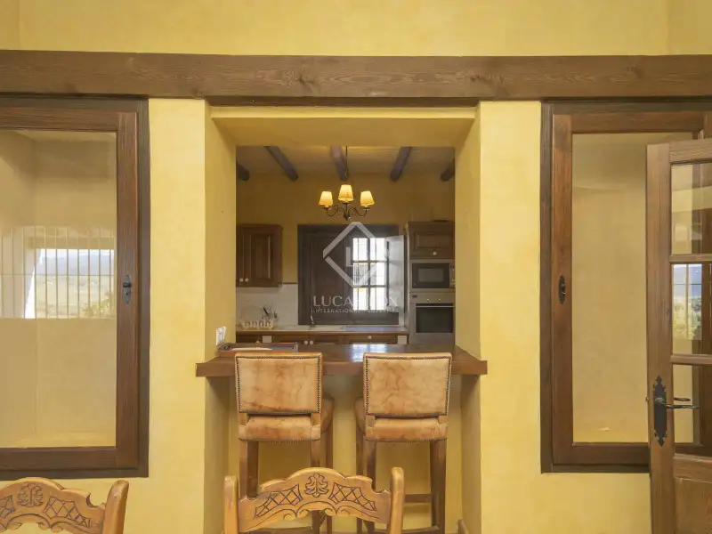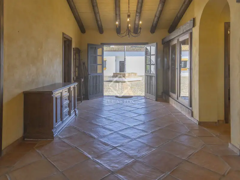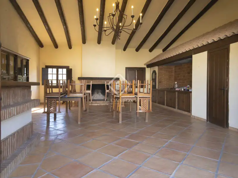 At the core of the estate stands a U-shaped Andalusian-style country house, covering an impressive 1,385 m² on a single floor. The farmhouse surrounds a paved courtyard and includes three separate dwellings, a chapel, a wine cellar-lounge, kitchens, offices, storerooms, and two covered porches. All seven habitable spaces are equipped with air conditioning and fireplaces for comfort. Large covered terraces and gardens surround the property, offering stunning panoramic views into the valley and to the mountain.
