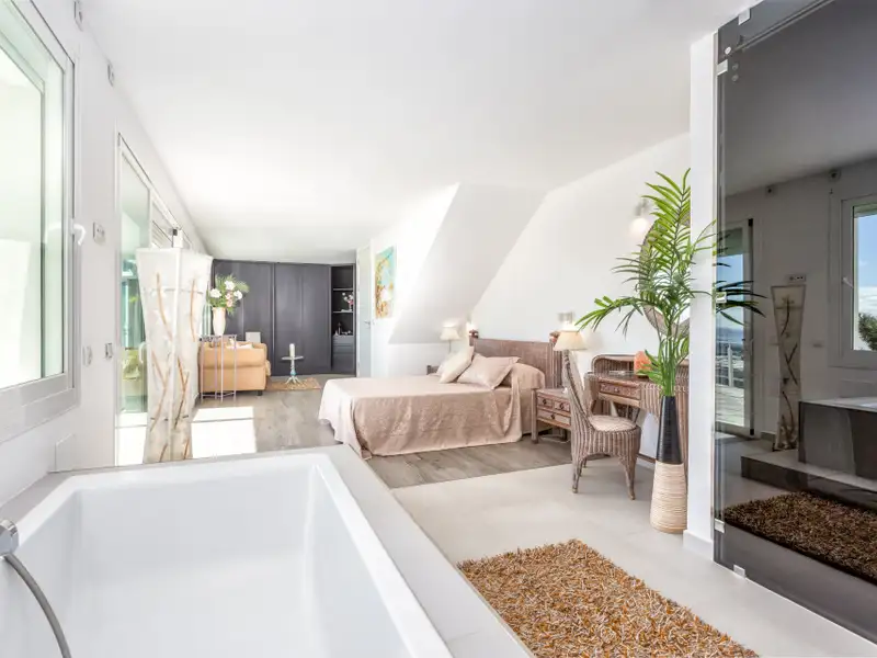 The interiors are perfectly connected with the outdoor spaces. Imagine a living room bathed in natural light, with a winter garden and a transparent dome that creates a unique atmosphere. The kitchen, with an impressive central island and fireplace, offers a functional and cozy space with stunning views of the Mediterranean. The property features two exclusive 45 m² suites and five bright double bedrooms, designed with style and comfort, ideal for family or guests.
