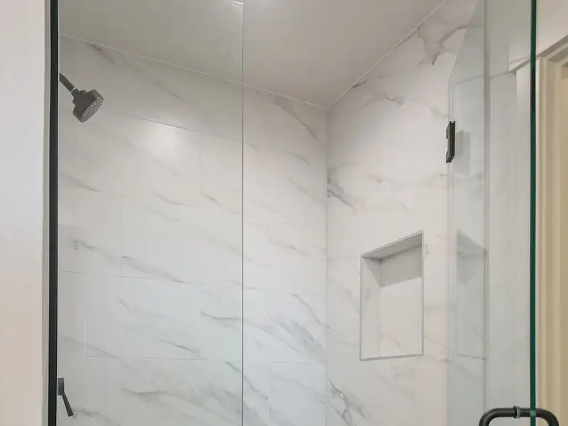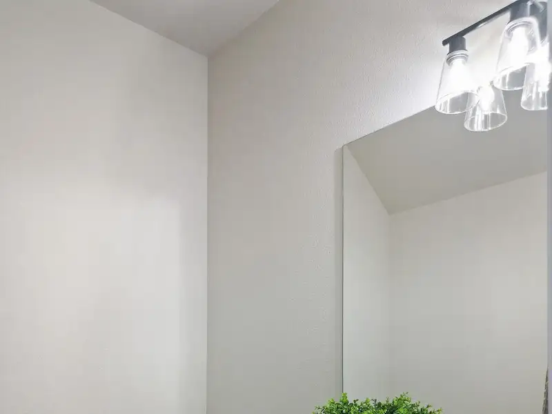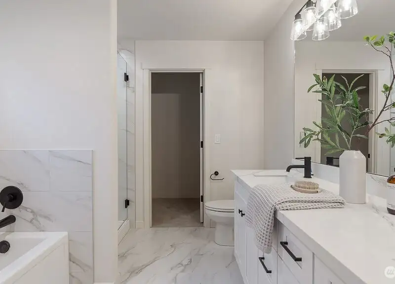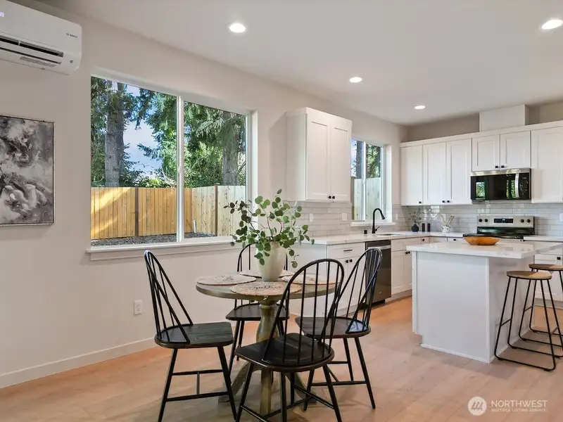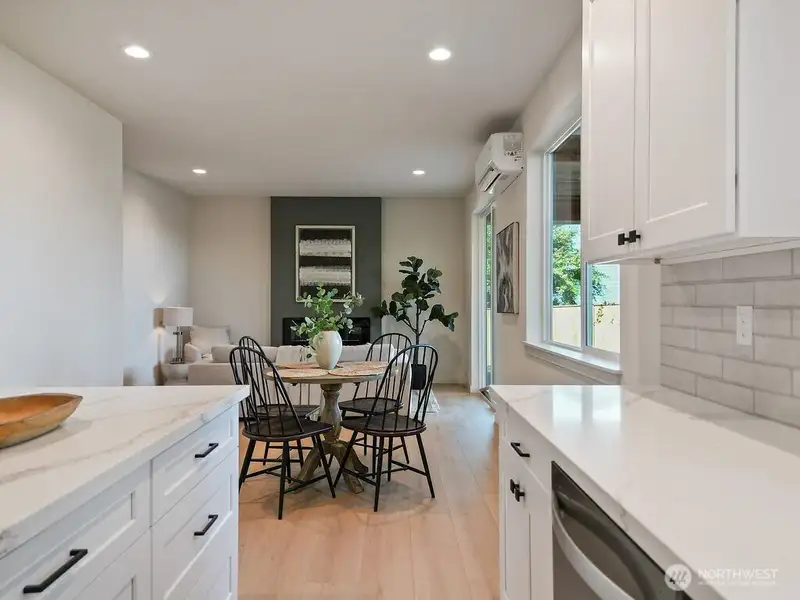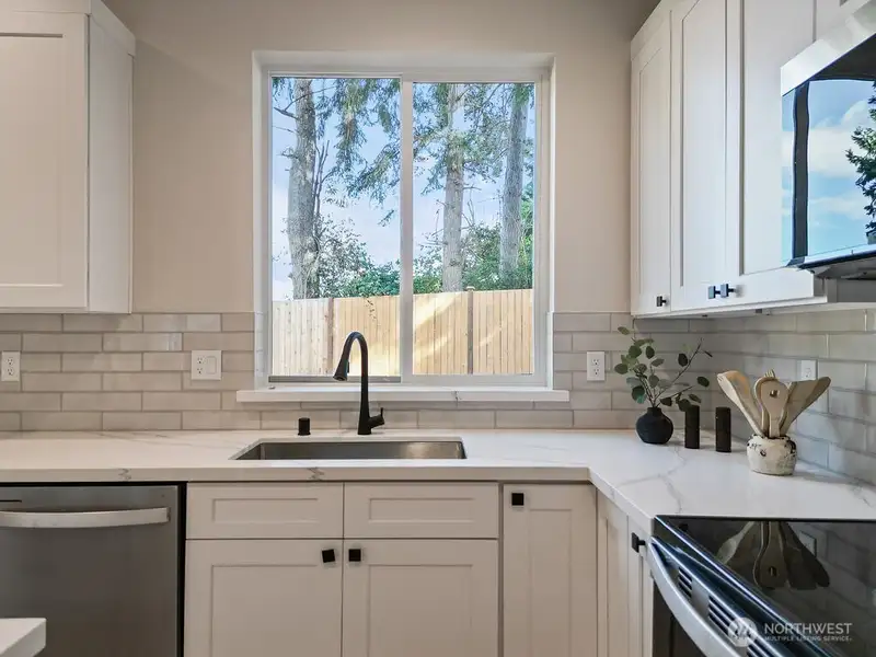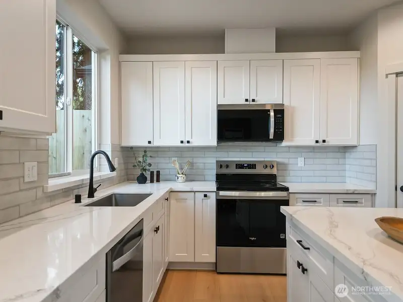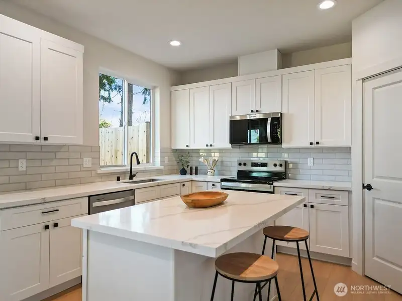 - Kitchen with white shaker cabinets and quartz counters