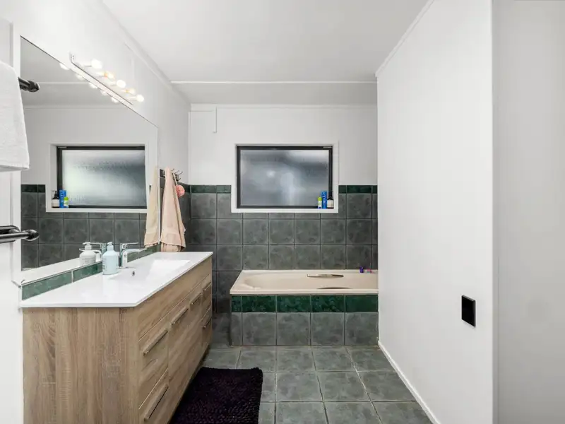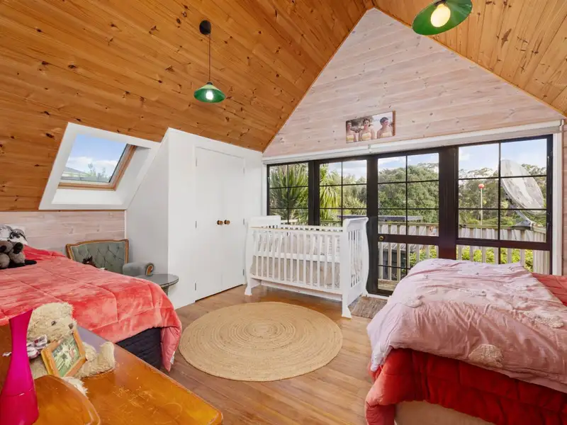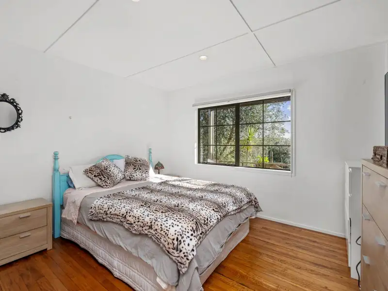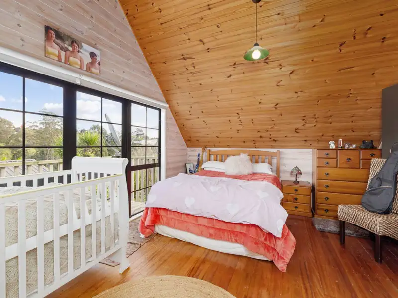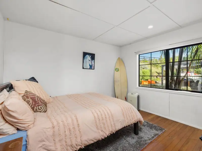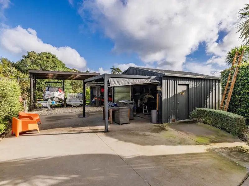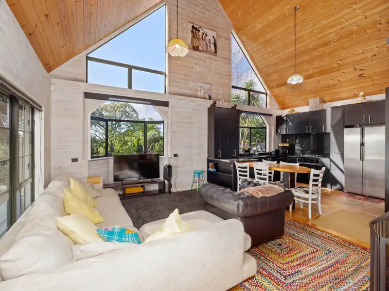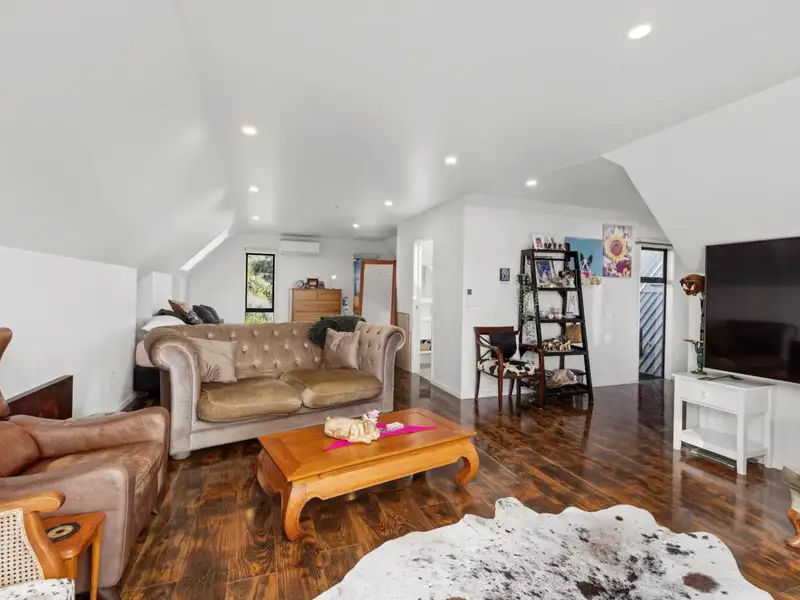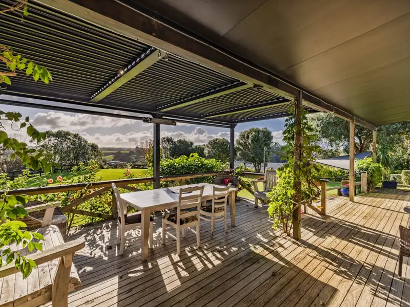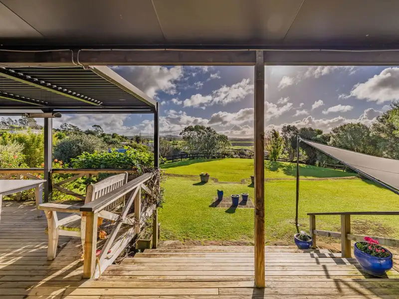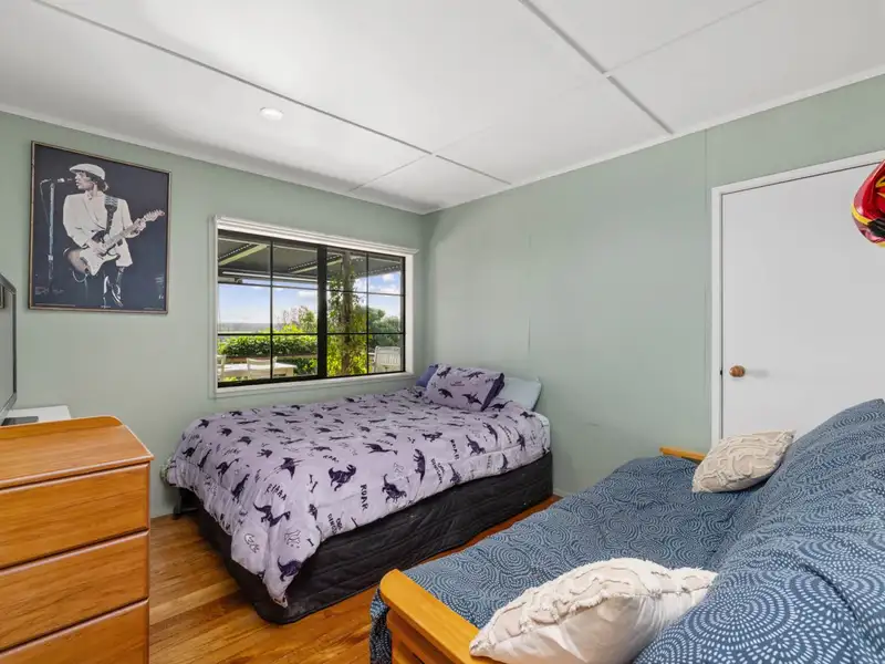 The plastered block and cedar home is set within landscaped gardens with commanding views across the valley to Access Heights and Kerikeri Golf Course. The heart of the home is an expansive open-plan modern kitchen, dining, and lounge area, accentuated by a high vaulted ceiling, two charming bay windows, and breathtaking floor-to-ceiling northwest-facing windows. A wood burner ensures year-round comfort, and French doors lead to a large entertainer's deck, seamlessly connecting indoor and outdoor living.
