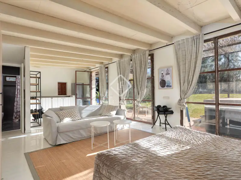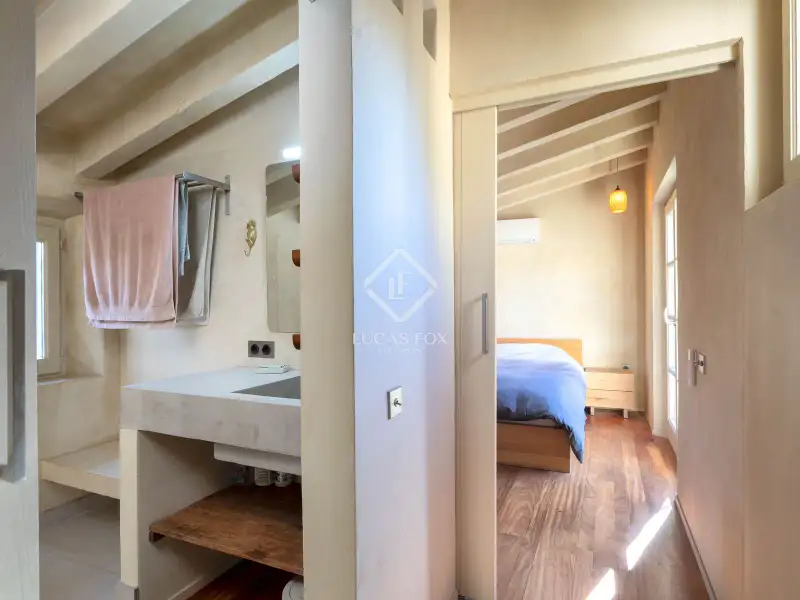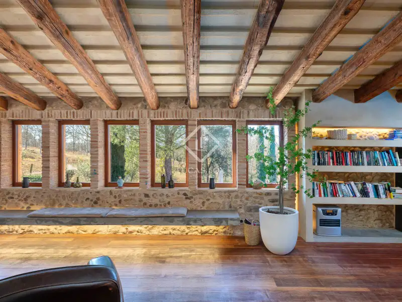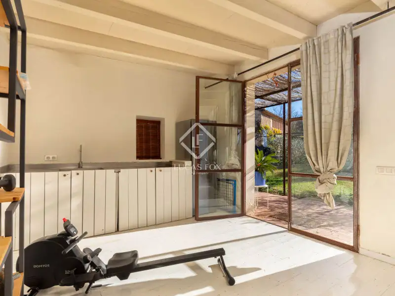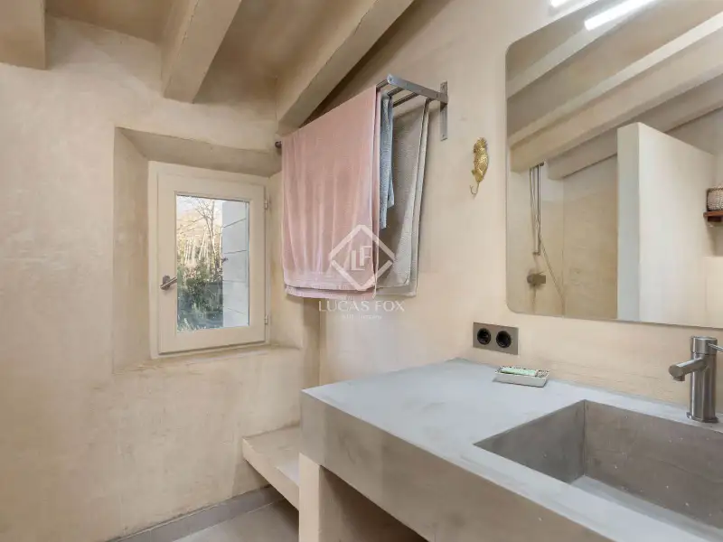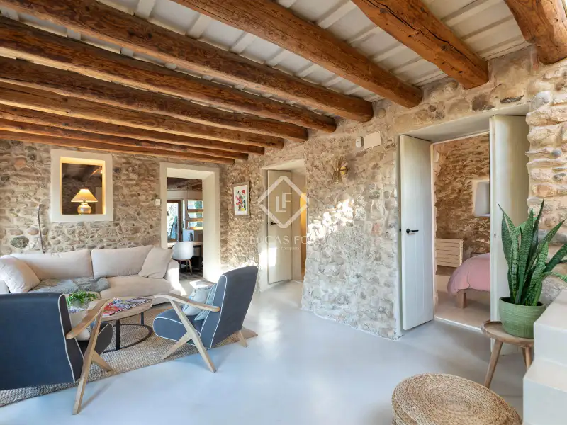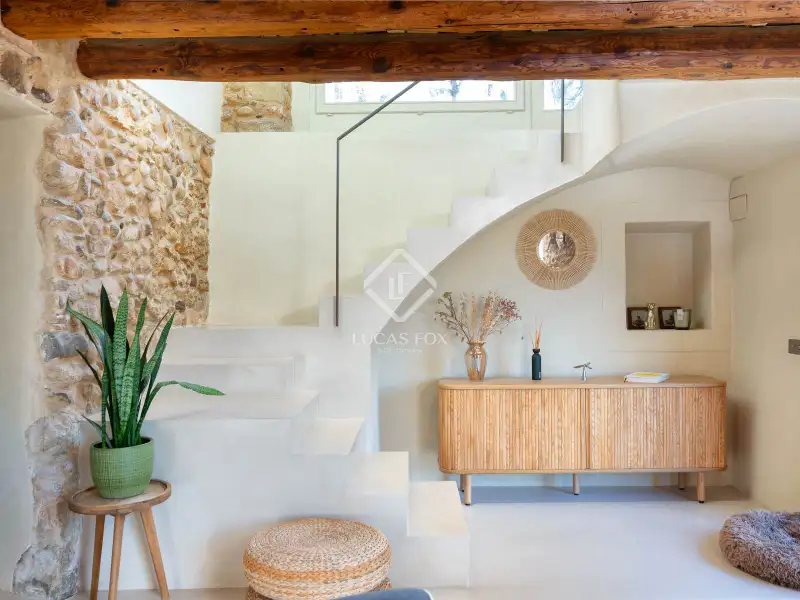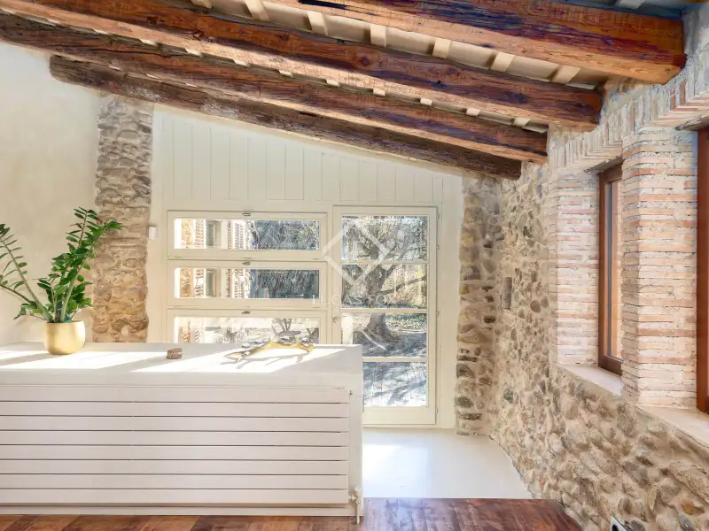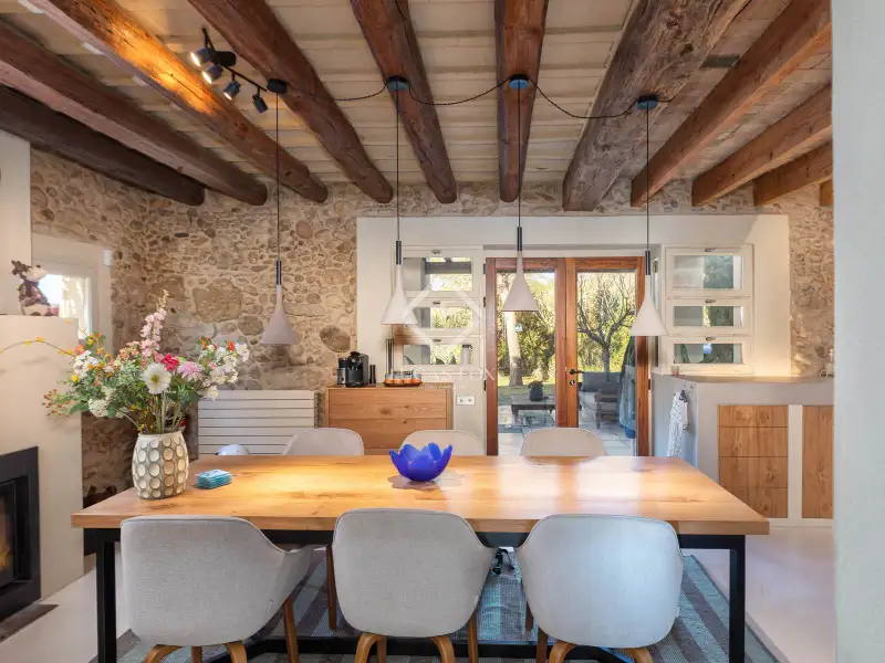 This property offers the perfect mix of rural charm and modern comfort. The finishes throughout the house are of the highest quality: microcement and brushed-finish walls blend perfectly with the rustic, historic elements such as wooden ceilings and exposed stone walls. The combination of abundant natural light and warm LED lighting beautifully highlights the inviting and charming character of the house.