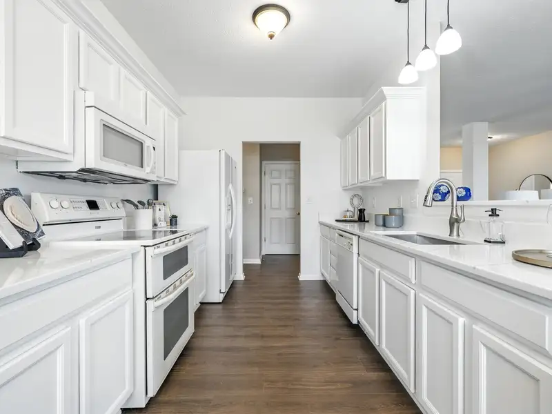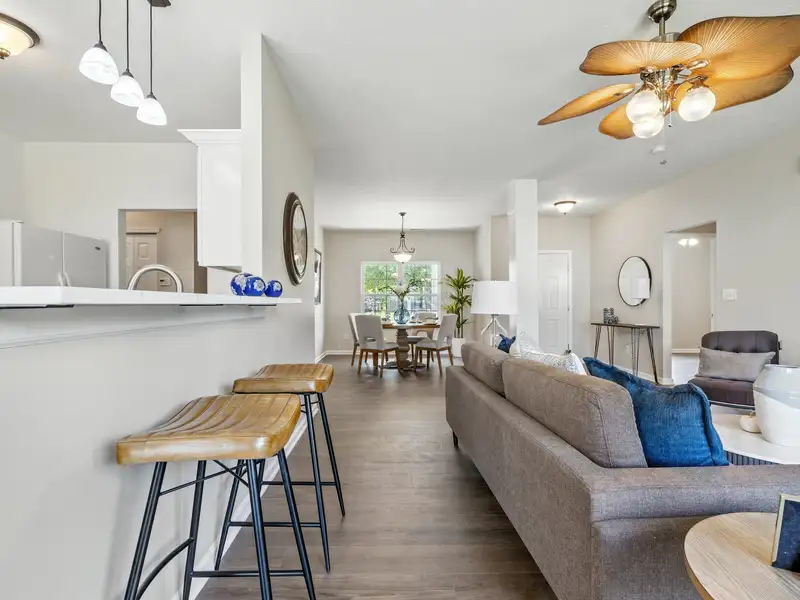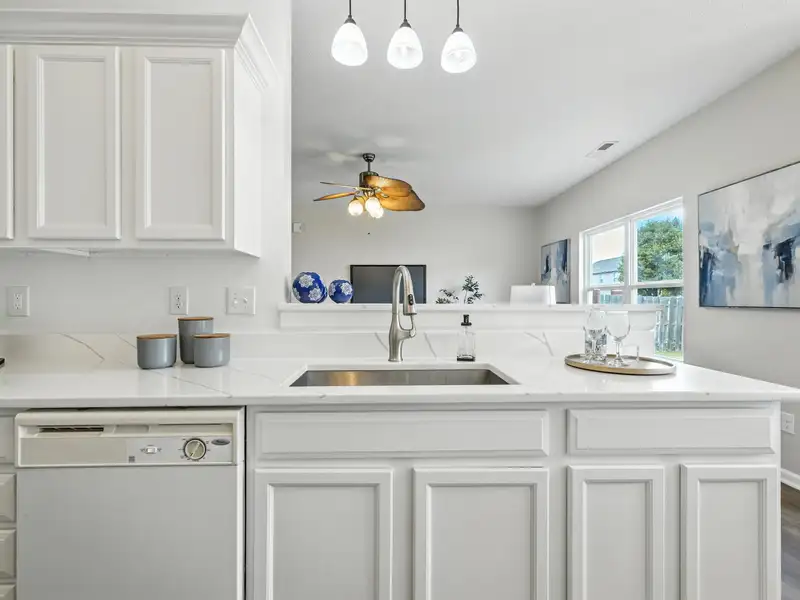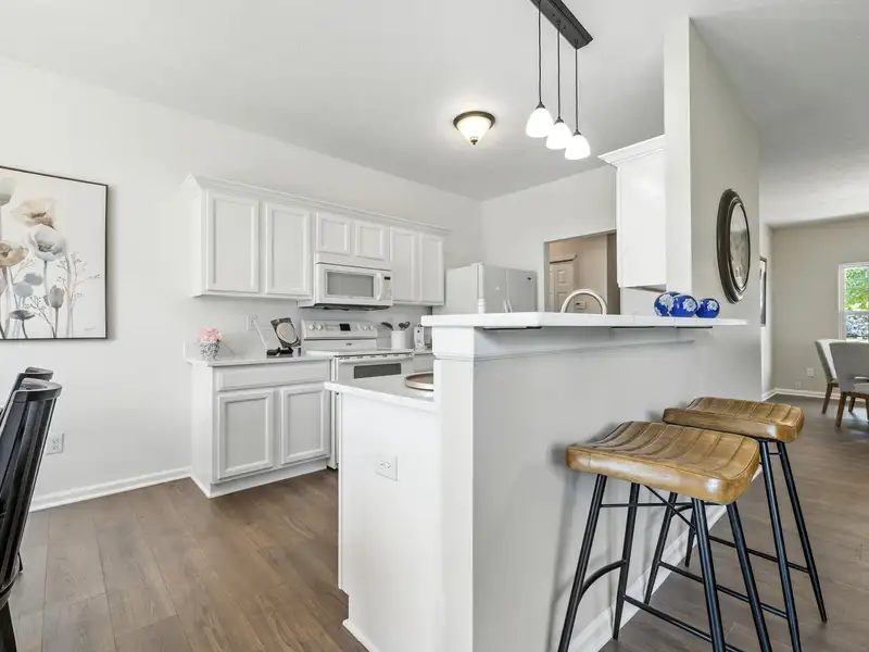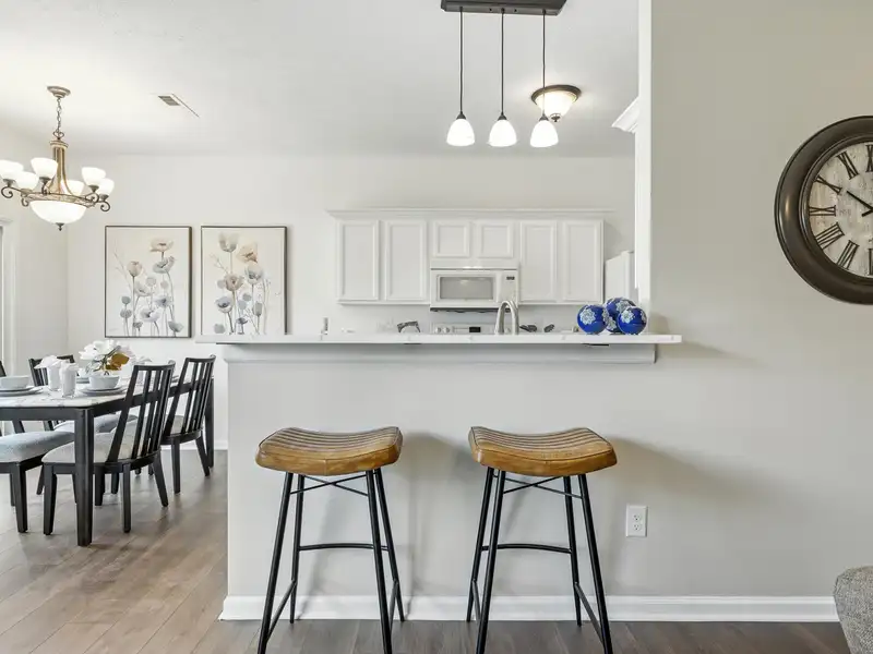- Kitchen with quartz countertops and bar seating