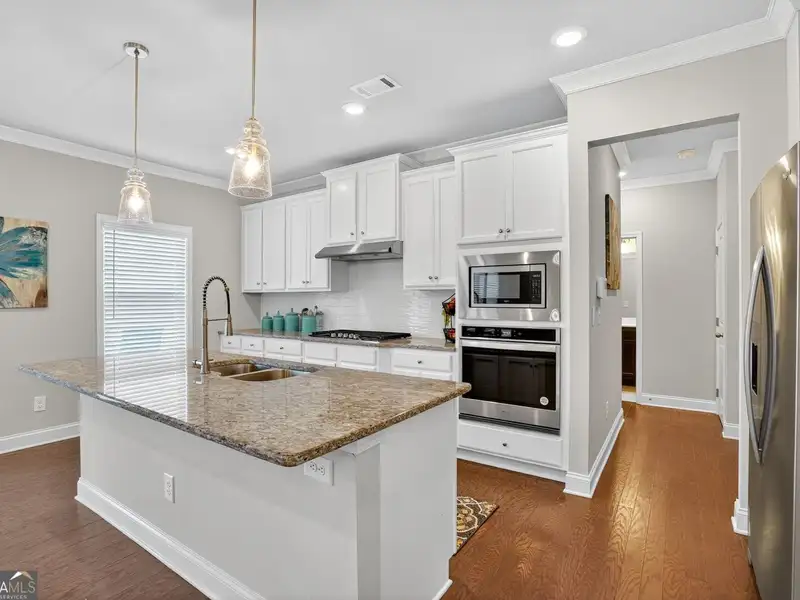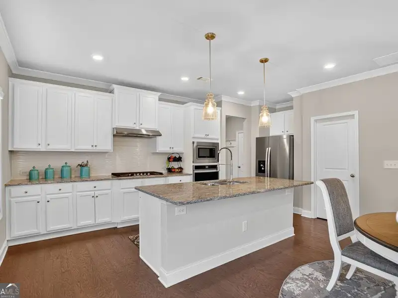 - Chef's kitchen with granite island and white cabinets