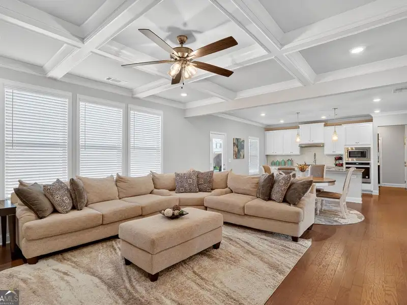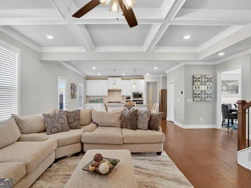 - Fireplace with coffered ceiling in family room