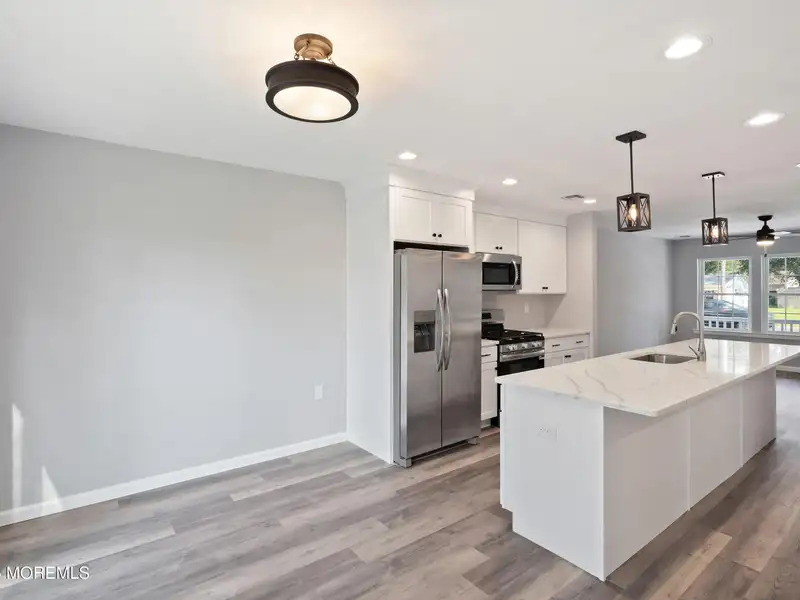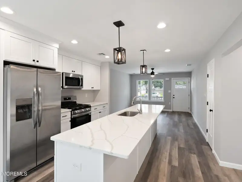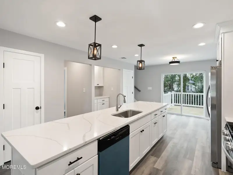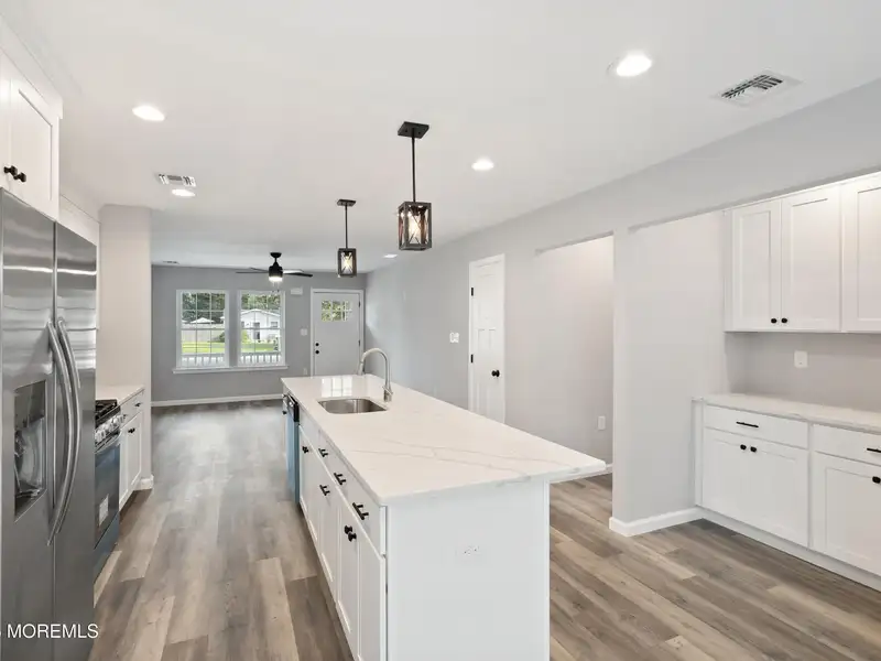 - Kitchen with quartz countertops and large island