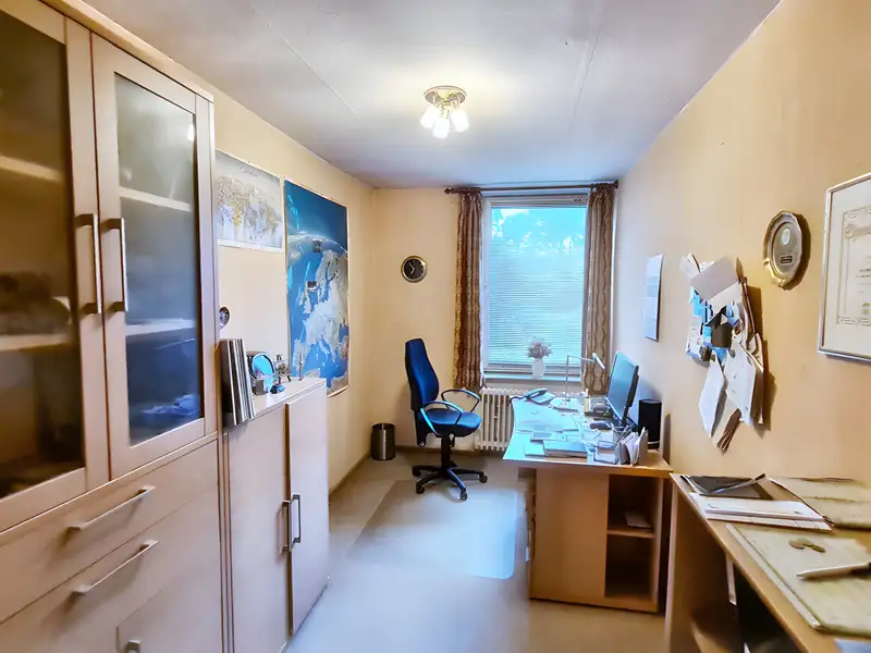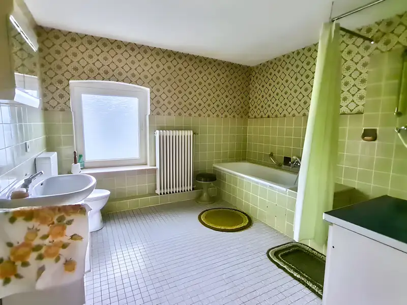 The property is spread over a total of six rooms and thus offers sufficient space for individual use - whether as a spacious family home, multi-generational living or living and working under one roof. On the first floor, the central hallway leads into the spacious living room, which is pleasantly lit by large windows. The adjoining fitted kitchen is included in the purchase price and forms the focal point of everyday life. There are also two functional bathrooms on this level - ensuring comfort even for larger households.