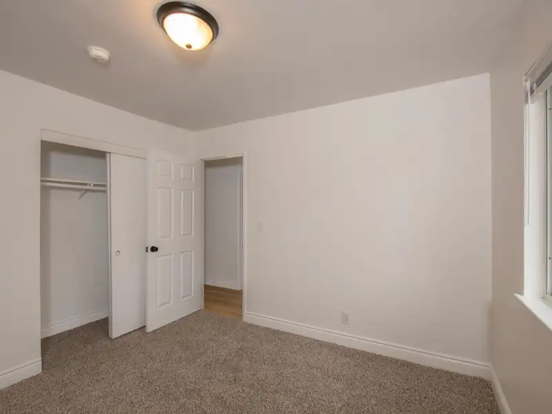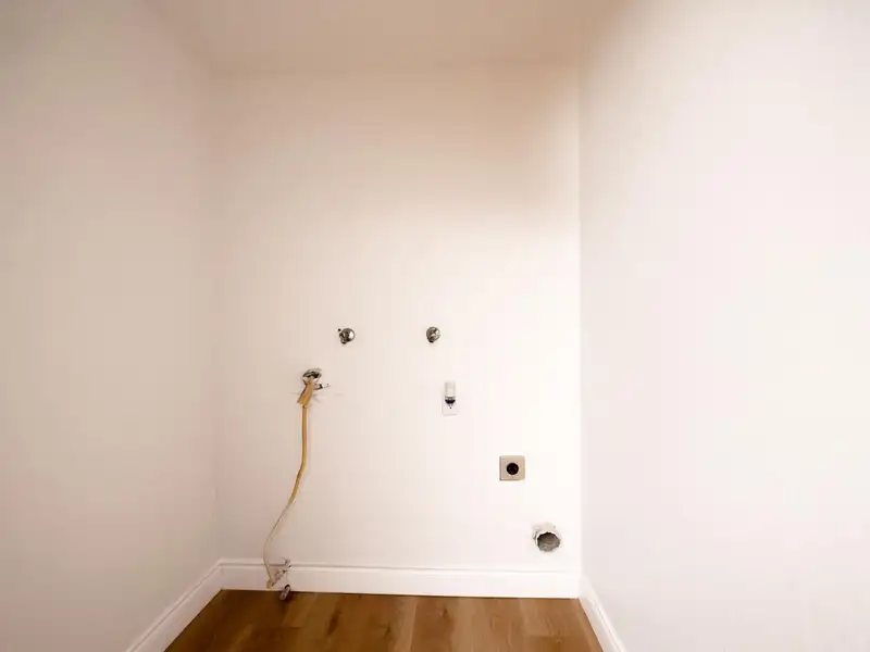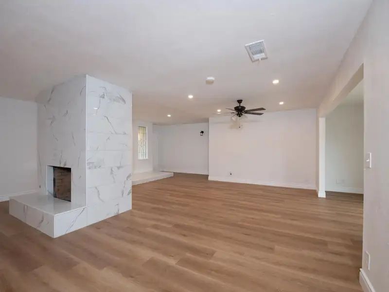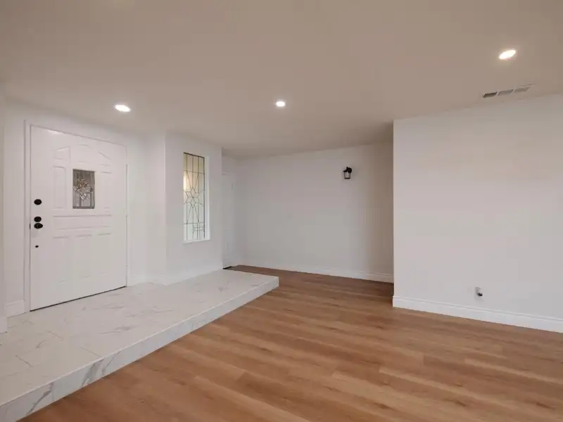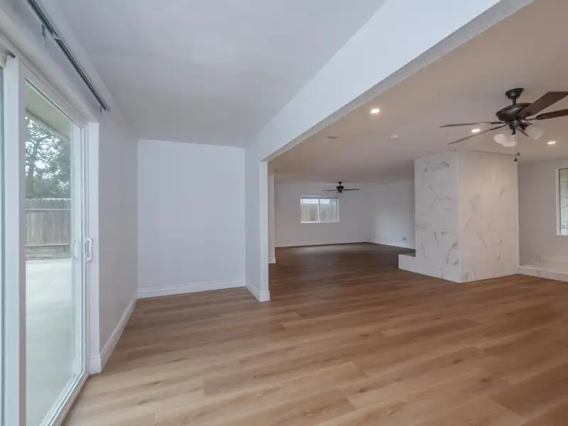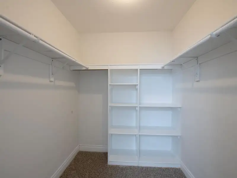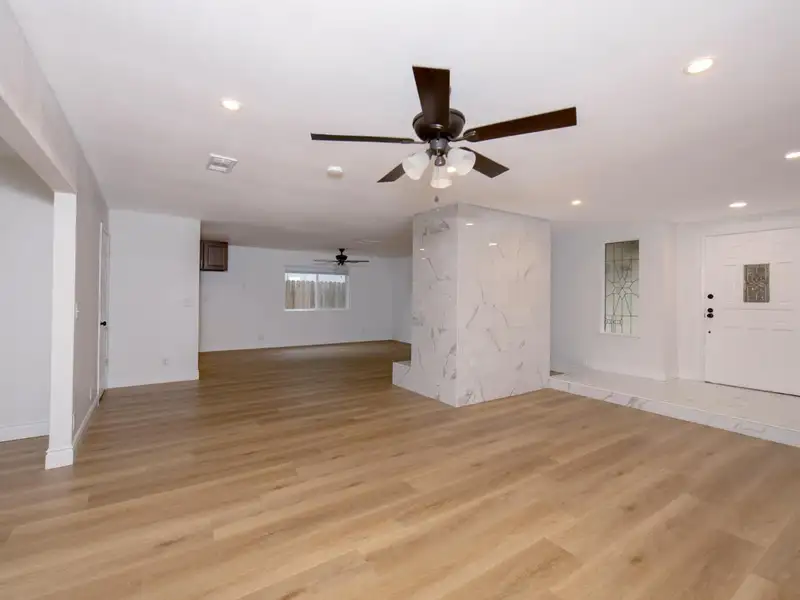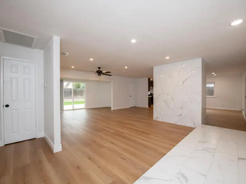 - Neutral laminate flooring throughout