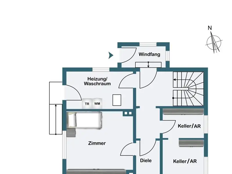 The special feature of the building is that the building services and two traditional cellar/storage rooms are located on the first floor. This means that the living space on the first floor is only approx. 34.5 m². There are also two rooms on the first floor, one of which has access to the spacious, covered terrace, a daylight bathroom with bath and shower and a room that offers the possibility/connections for a kitchen. The heating/technical room is also a laundry and drying room. From here, ground-level access leads via a ramp to the garden/terrace.