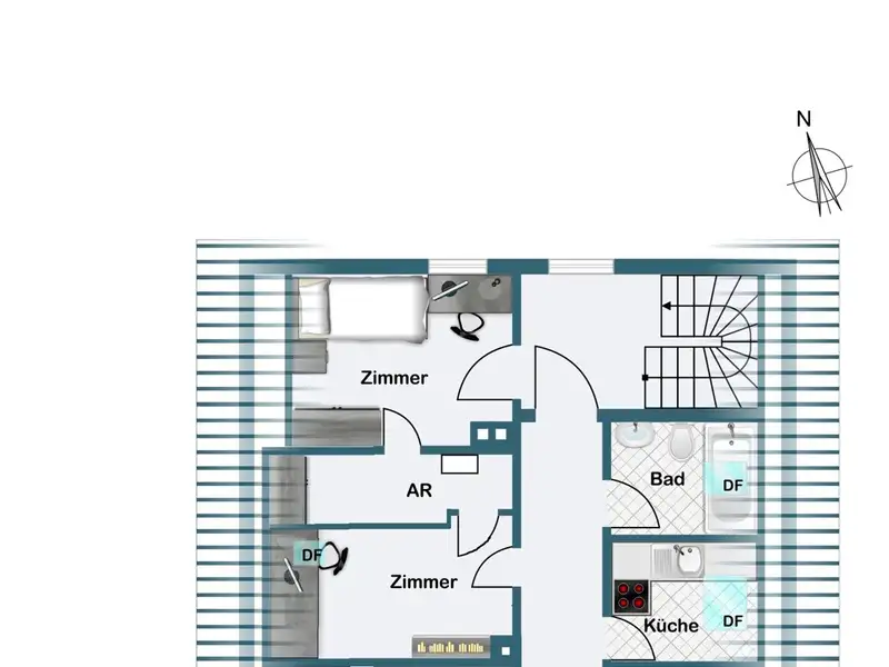 On the top floor, you will find four rooms that can be used individually as bedrooms, children's rooms, guest rooms or studies. There is also a daylight bathroom with bathtub and a separate kitchen.