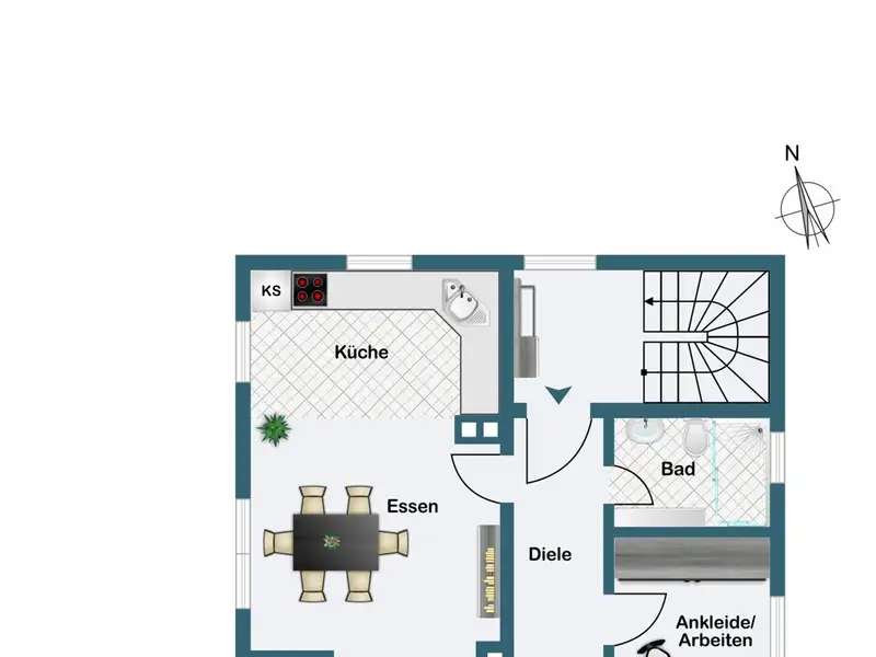 The focal point of the main apartment on the 1st floor is the bright and spacious living/dining area. From there you can access the sunny south-west-facing balcony. The wood-burning stove creates a cozy atmosphere. The open kitchen adjoins the dining area. Also on the upper floor are the bedroom with a dressing room or study area and a daylight bathroom with a large walk-in shower.