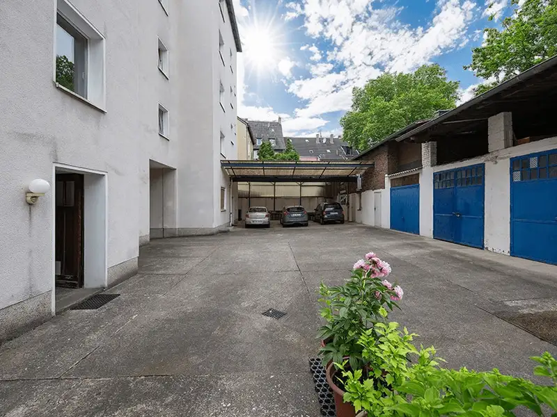 - Large courtyard with multiple garages