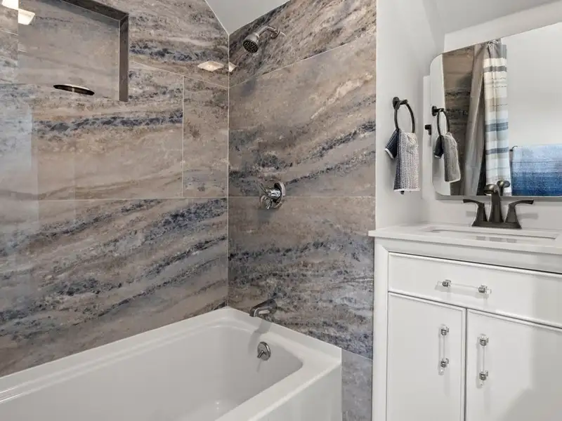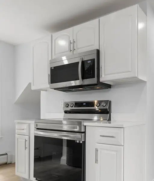 • Kitchen with stainless appliances and quartz counters