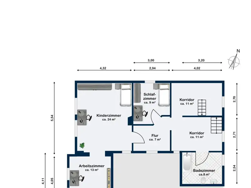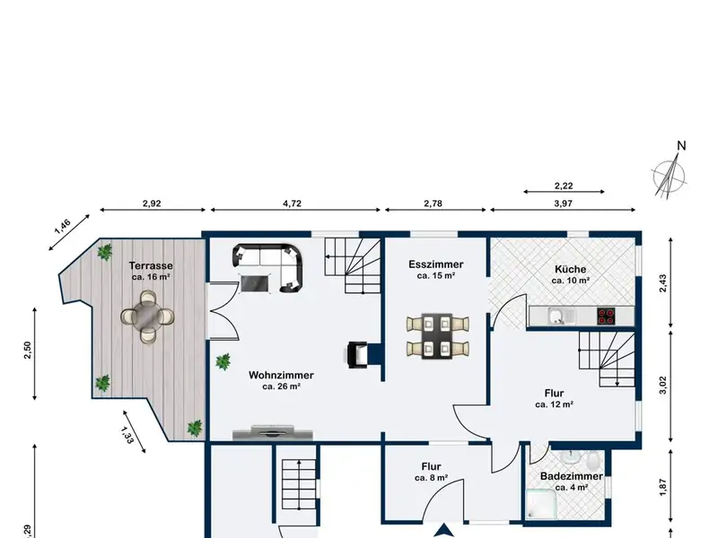 The first floor of the house impresses with its bright and friendly living areas. The kitchen, which is almost as good as new, offers plenty of space for culinary creations and has a functional design. The adjoining dining area invites you to enjoy meals together and sociable evenings. From the living room you can reach the beautifully landscaped garden, which becomes an outdoor living room, especially in the summer months, and extends the generous space in the house considerably.