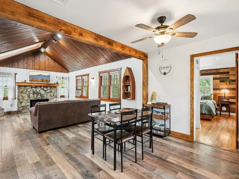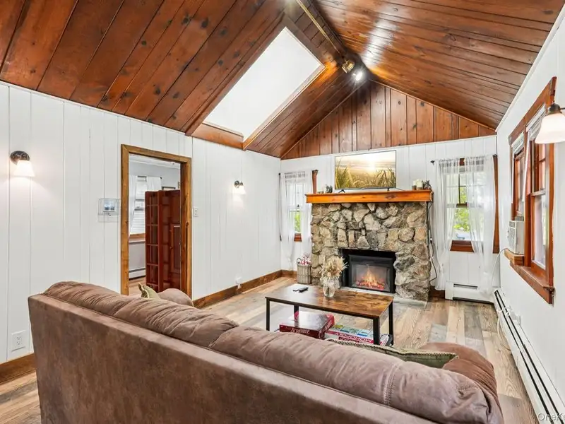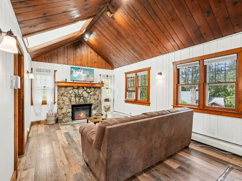 - Cozy living room with fieldstone fireplace