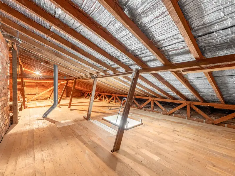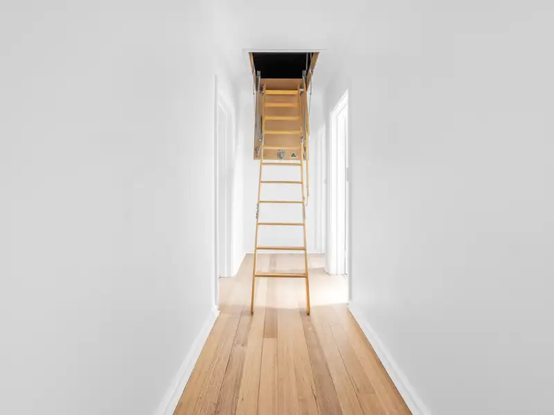 * Fold-away wood stairs providing access to the attic, offering potential for a full attic conversion