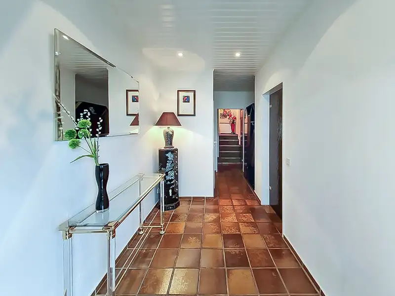 This floor is divided into the hallway area with ample space for a checkroom, the kitchen with outside access to the terrace, followed by the dining room. The living area is further divided into a living area, fireplace room and gallery.