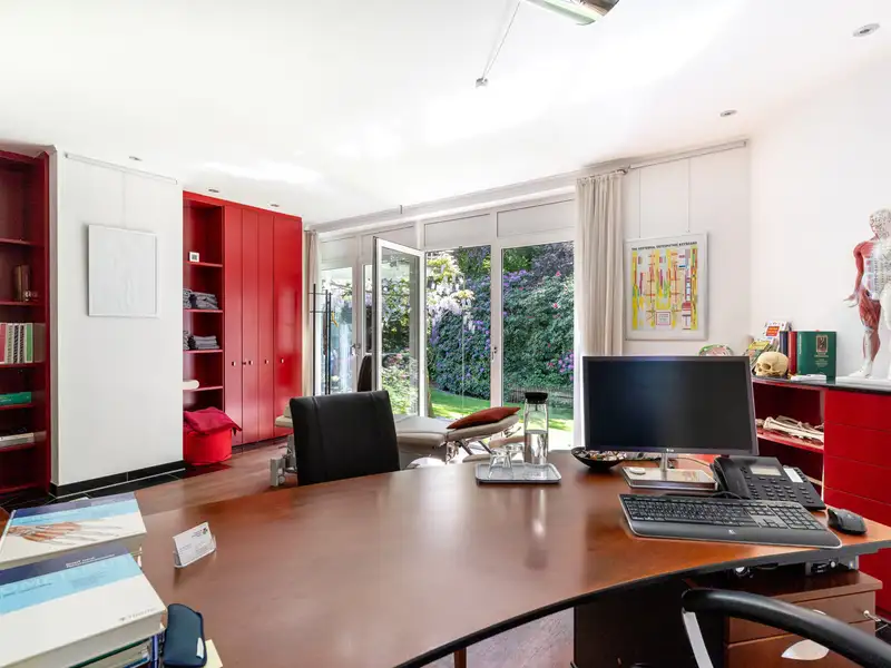 The practice on the first floor covers approx. 185 m², the one on the upper floor approx. 60 m² and the practice on the top floor approx. 52 m². The two small practices are currently rented out. The large practice on the first floor is run by the owners themselves.