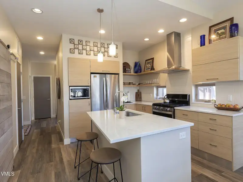 - Kitchen with stone countertops, stainless appliances