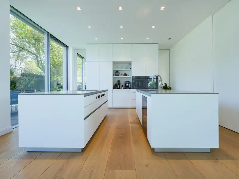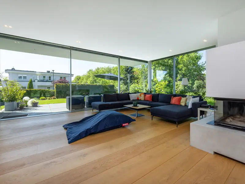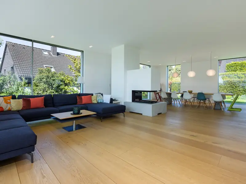 The living/dining area is divided by an elegant fireplace, which can be seen from three sides through glass surfaces, creating a pleasant atmosphere. High-quality oak floorboards, five meters long and extra wide, underline the elegant ambience of the house.