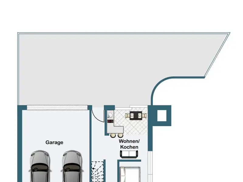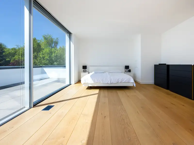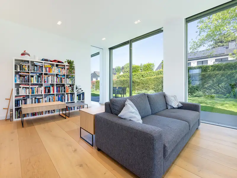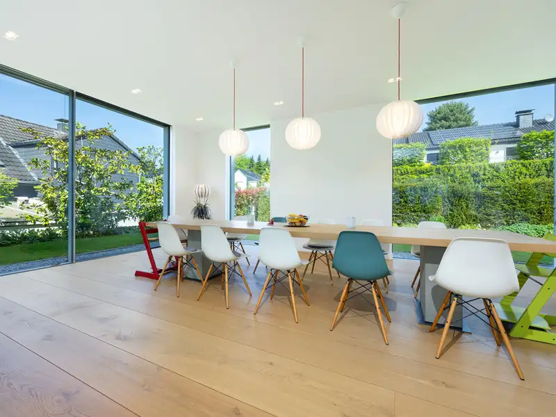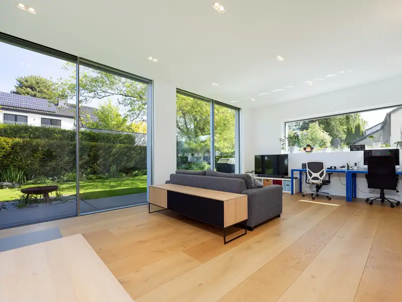 The light-flooded first floor with a room height of 3.00 meters impresses with floor-to-ceiling Sky Frame windows, some equipped with electric drives and complemented by electric blinds in a Venetian blind design.