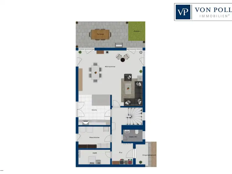 The heart of the house is the open, light-flooded living and dining area with direct access to the terrace. The open-plan design allows the seamless integration of your individual kitchen planning and offers generous space for cooking, eating and relaxing together.