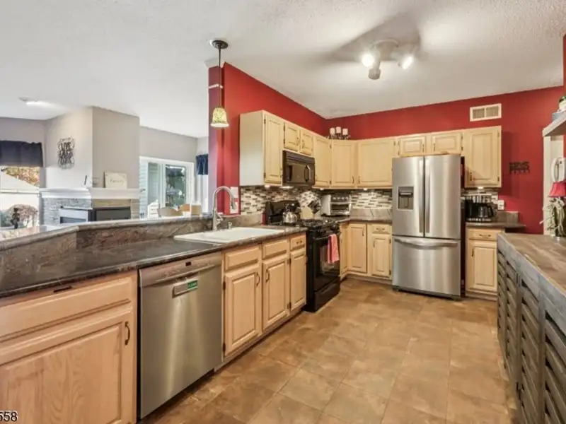 - Kitchen with granite counters and stainless appliances