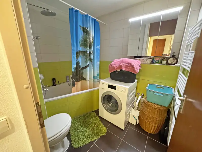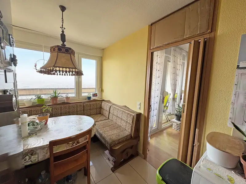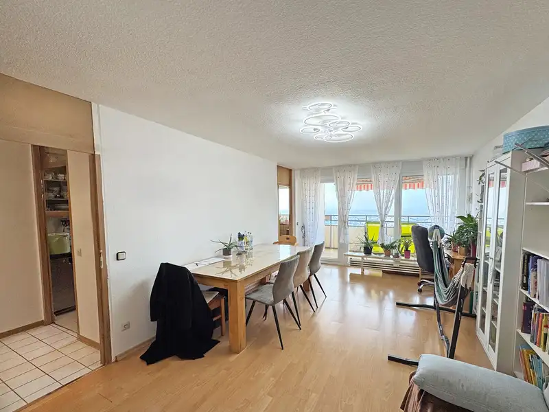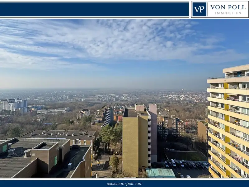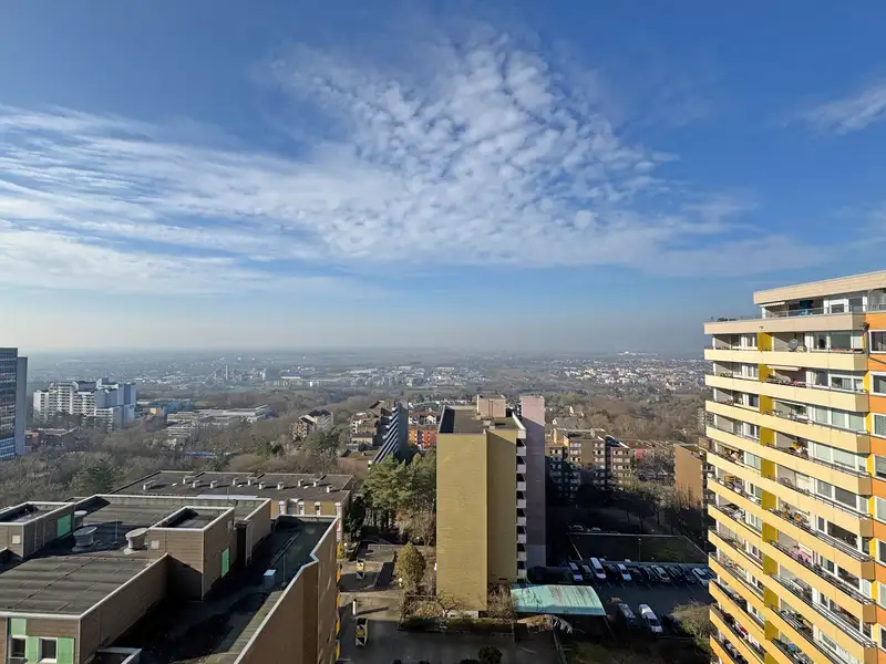 This well-maintained apartment with a living space of approx. 91 m² is located on the 13th floor of an apartment building that was built in 1979. It is located in a quiet but well-connected residential area, which impresses with its advantageous room layout and practical furnishings. The apartment comprises a total of three rooms, including two bedrooms. The spacious living and dining area is characterized by its brightness, which is ensured by large windows with natural light. From this area, you have access to one of the two balconies, which is also equipped with an awning. The second balcony is accessible via one of the bedrooms and offers further opportunities to enjoy the outdoors. The kitchen is equipped with a functional fitted kitchen and offers sufficient storage space as well as space for all standard electrical appliances. A separate guest WC completes the offer, while the main bathroom is equipped with a bathtub and WC. The apartment is heated by central oil heating and meets the well-maintained standard with solid furnishings. Classic flooring has been laid in the living rooms and bedrooms, while easy-care tiles have been laid in the kitchen, bathroom and guest WC. A particular advantage of this apartment is the existing elevator, which provides convenient access to the floor. There is also a cellar room that offers additional storage space. An underground parking space is available for your vehicle, providing secure and convenient parking. The location of the apartment impresses with its easy accessibility to shopping facilities, public transport, schools and kindergartens. The surrounding area is characterized by a well-developed infrastructure and short distances to all important facilities for daily needs. Thanks to the well thought-out layout, the apartment is suitable for both couples and small families and ensures a pleasant living atmosphere. For further information or to arrange a viewing appointment, please do not hesitate to contact us at any time.