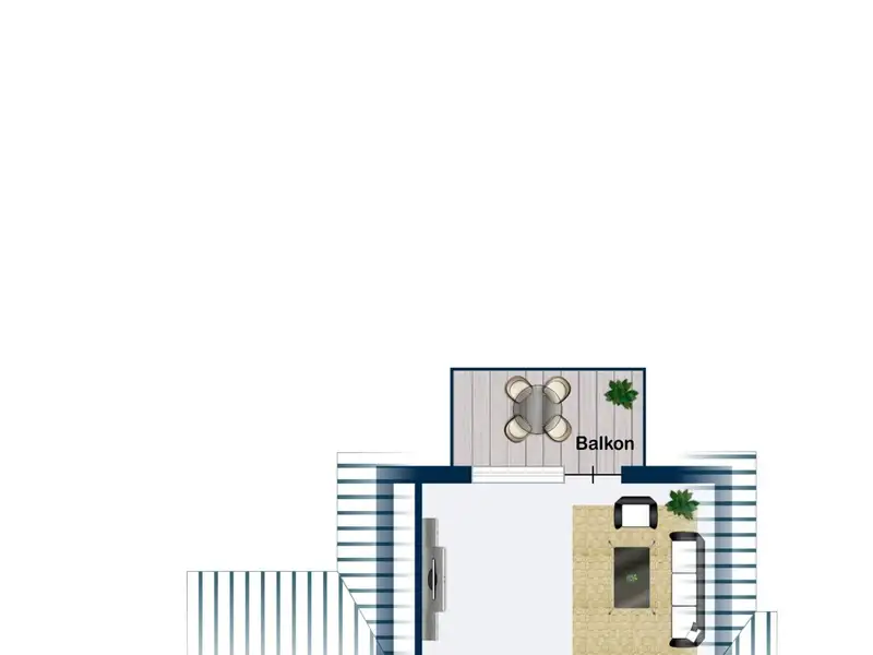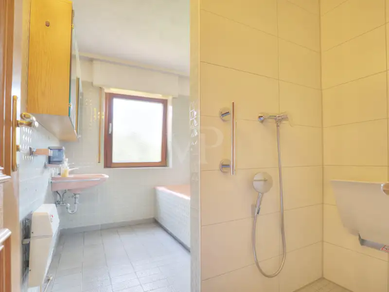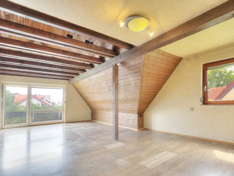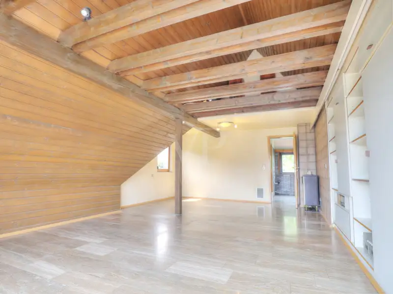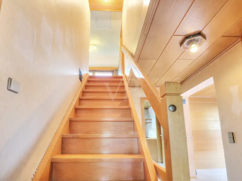 A stylish wooden staircase leads to the upper floor, which boasts three further rooms that can be used in a variety of ways - as a master bedroom, children's room or home office. In another room, directly behind the staircase, there are all the connections for a kitchen, which means that the floor can also be used as a separate living unit. From the largest of the three rooms, you can access the sunny balcony with a view of the greenery, an ideal place to relax.