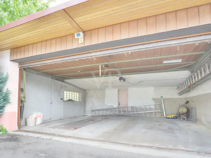 The spacious plot offers a wide range of design options: In addition to lawns and planting areas, there is ample space for play areas, vegetable patches or a further patio design. A small garden shed is also available. The almost completely basement area and a large double garage with electric garage door provide ample storage space.